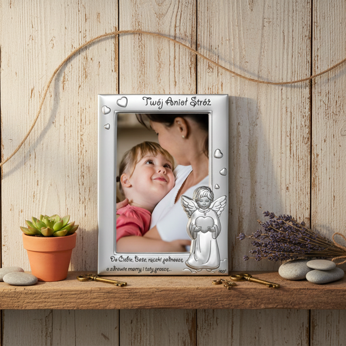 Srebrna ramka MIRO-SILVER® z motywem Anioła Stróża i wytłoczonym napisem modlitewnym. Wzruszająca pamiątka Chrztu Świętego, narodzin lub roczku, wykonana we Włoszech, z personalizacją wyłącznie grawerem laserowym.