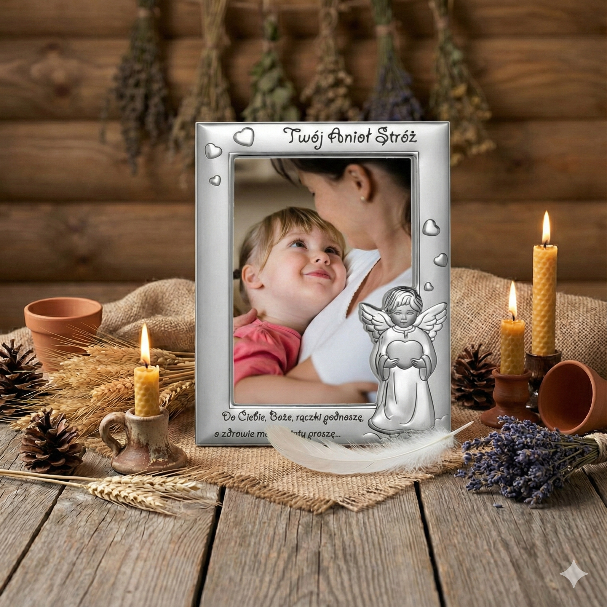 Wytłoczony napis: „Do Ciebie rączki podnoszę i o zdrowie Mamy i Taty proszę” nadaje ramce głęboko emocjonalny i modlitewny charakter. To subtelne przypomnienie o więzi rodzinnej, trosce oraz duchowym wymiarze sakramentu Chrztu Świętego.