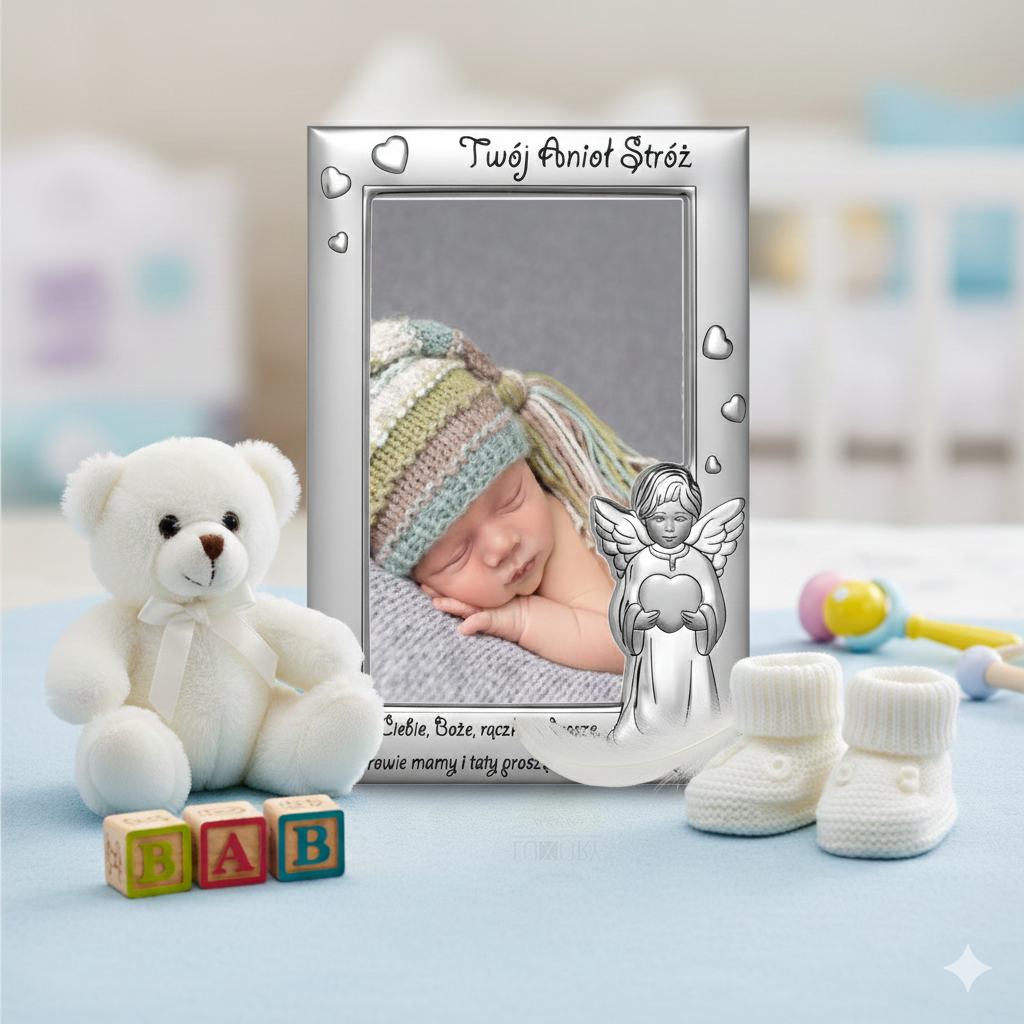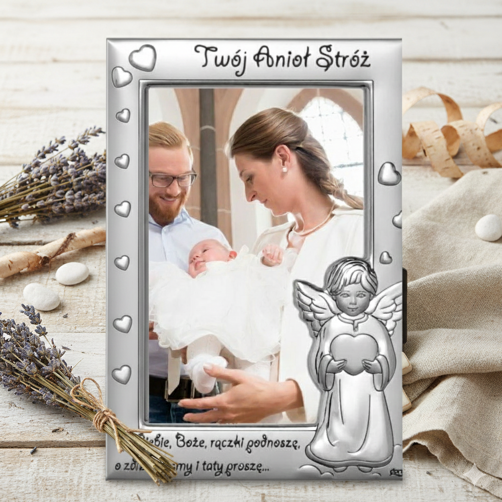 Srebrna ramka AG999 na zdjęcie 10×15 cm z kolekcji SILVER BAPTISM™ z motywem Anioła Stróża z serduszkiem to wyjątkowa pamiątka Chrztu Świętego oraz pierwszych chwil życia dziecka. Delikatna postać aniołka symbolizuje Bożą obecność, opiekę i miłość, które towarzyszą dziecku od pierwszych dni.