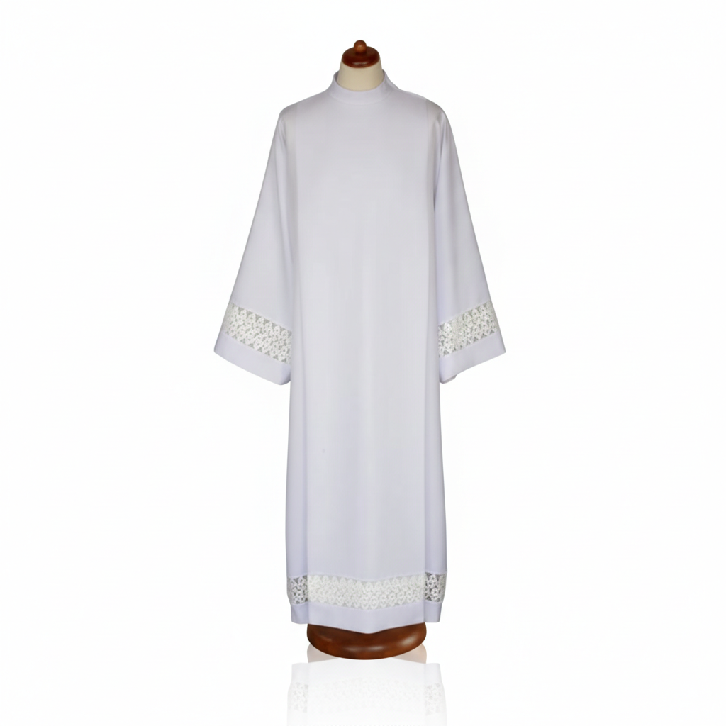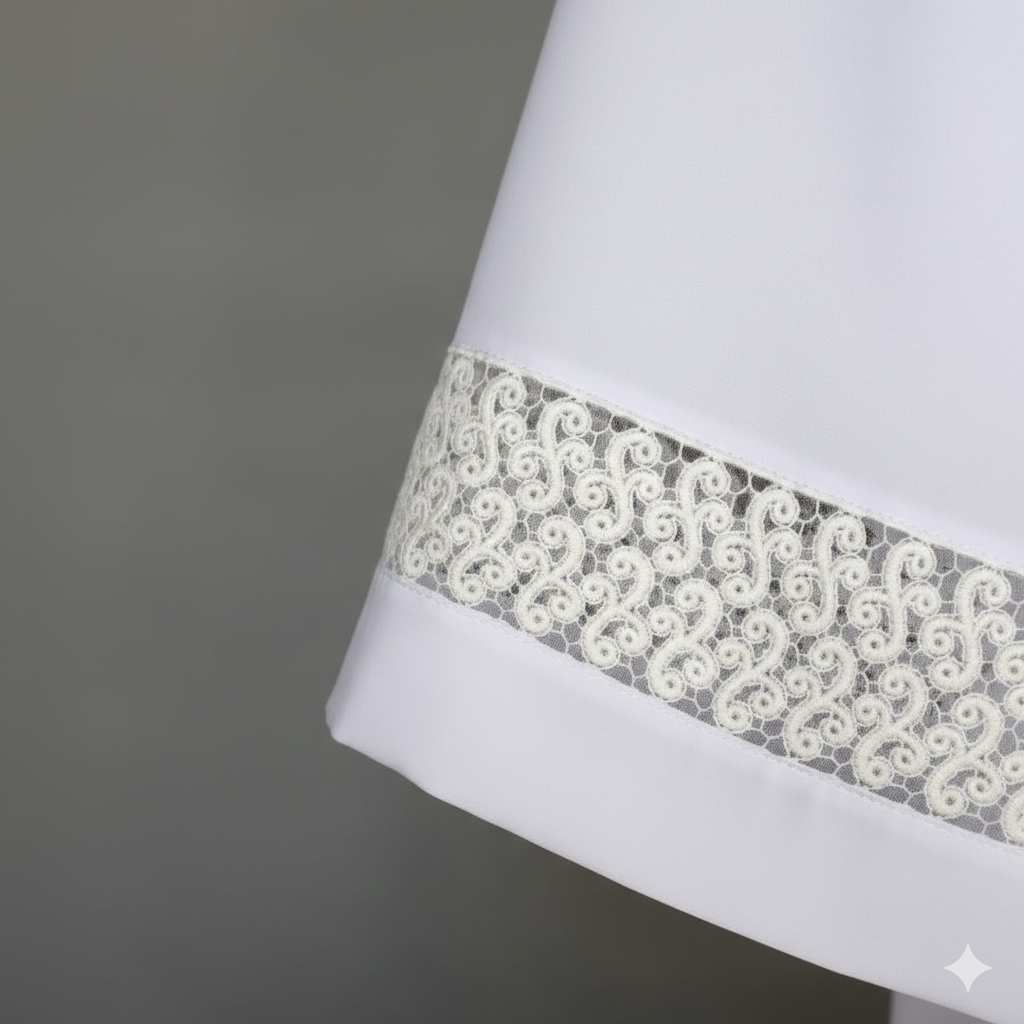 Naturalna bawełniana wstawka podkreśla tradycyjny styl alby i zachowuje jej liturgiczną powagę. To rozwiązanie odpowiednie zarówno do codziennych celebracji, jak i uroczystości parafialnych.