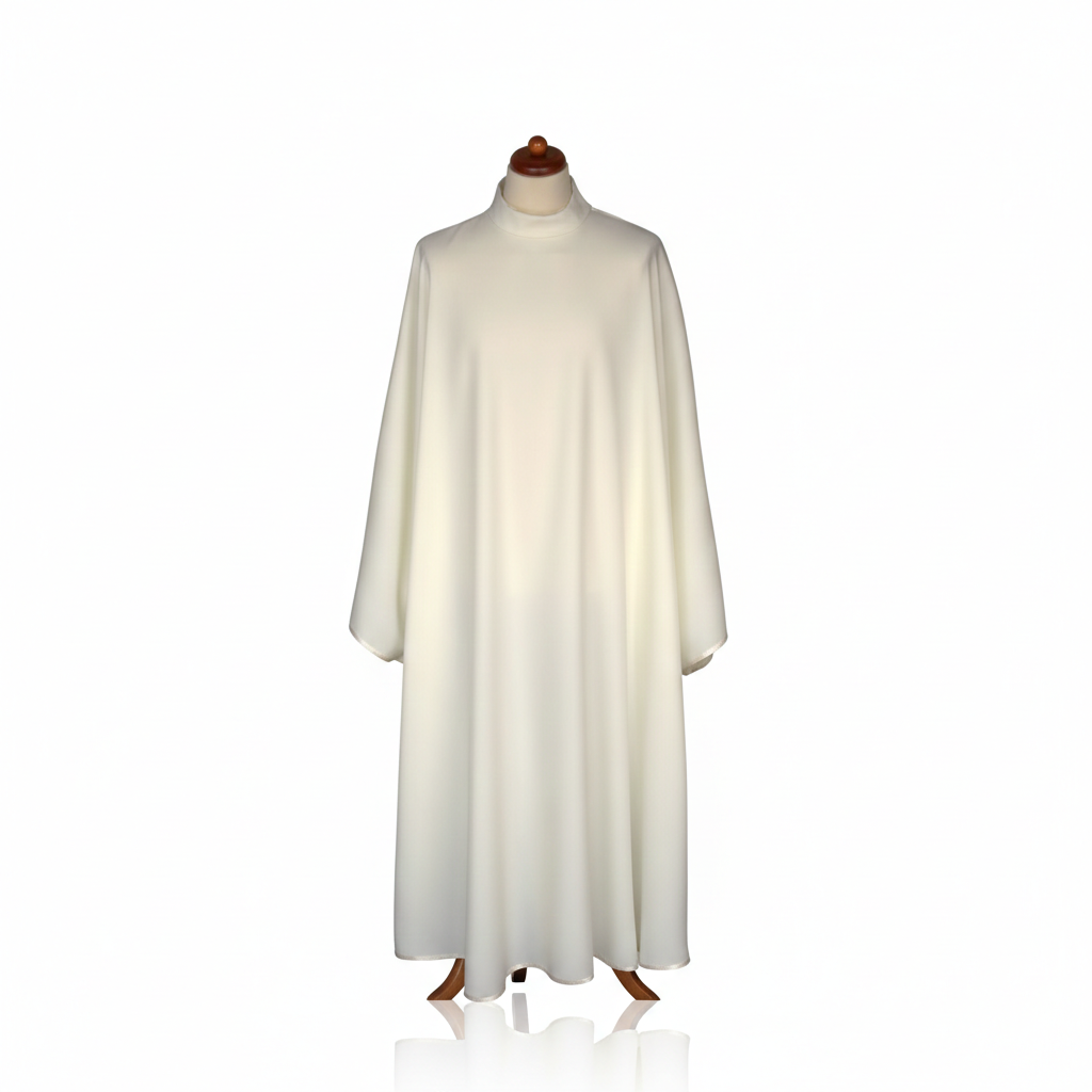 Albo-ornat wykonany z poliestrowej tkaniny w kolorze ecru. Zapięcie na ramieniu. Może pełnić funkcję alby liturgicznej lub uproszczonego ornatu.
