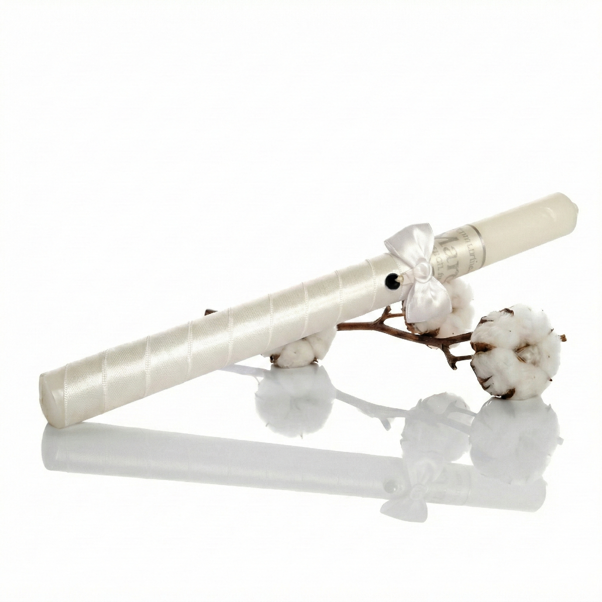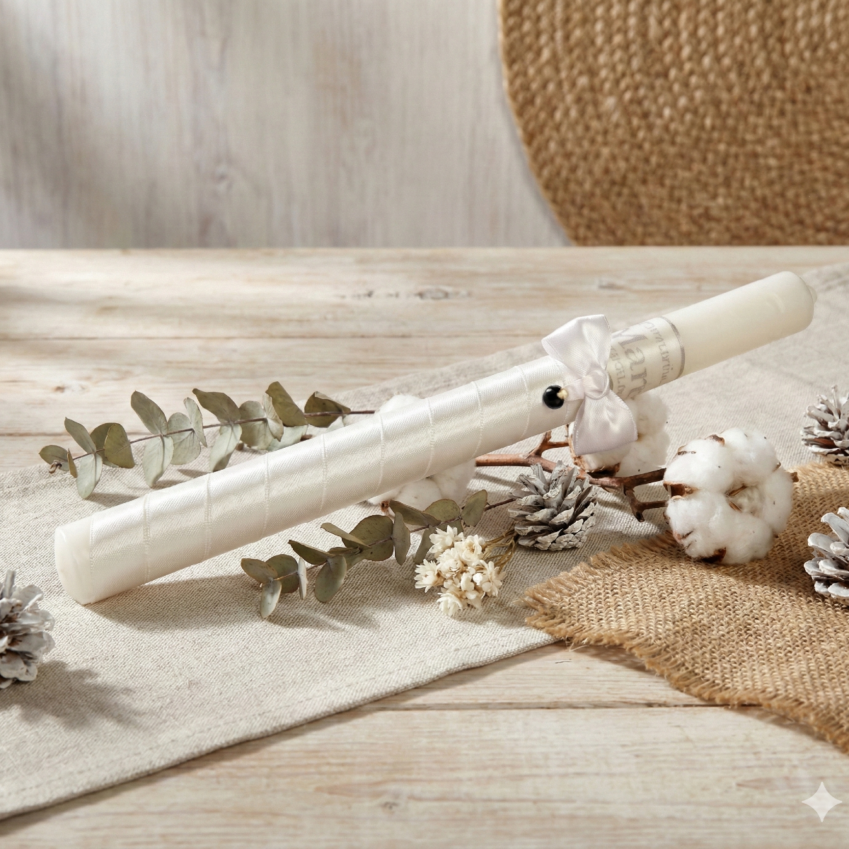 Centralnym elementem dekoracyjnym świecy jest ręcznie nakładany krzyżyk ze srebra próby 925. Srebro w tradycji chrześcijańskiej symbolizuje czystość intencji, prawdę oraz trwałość wartości duchowych. Każdy detal został wykonany z najwyższą starannością.