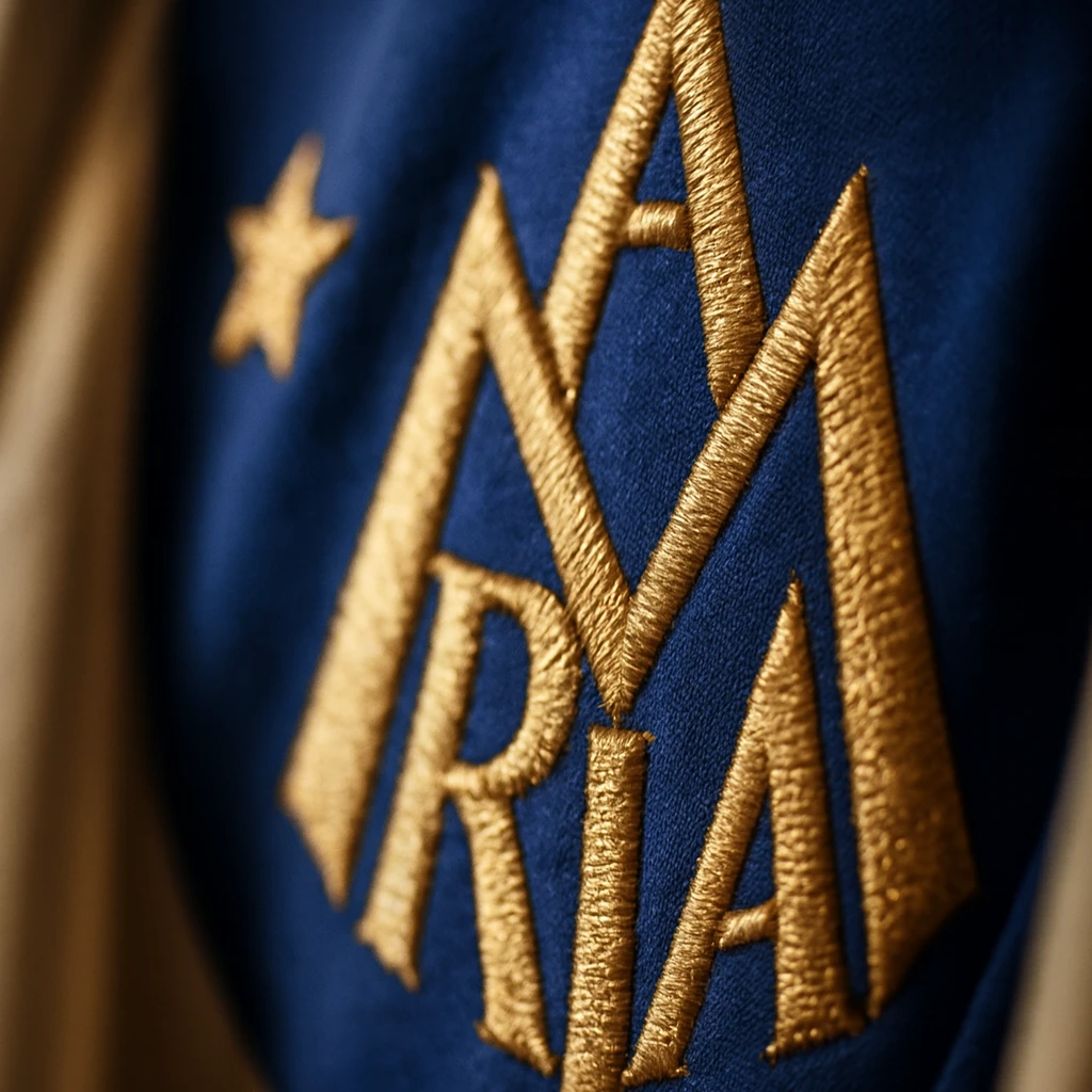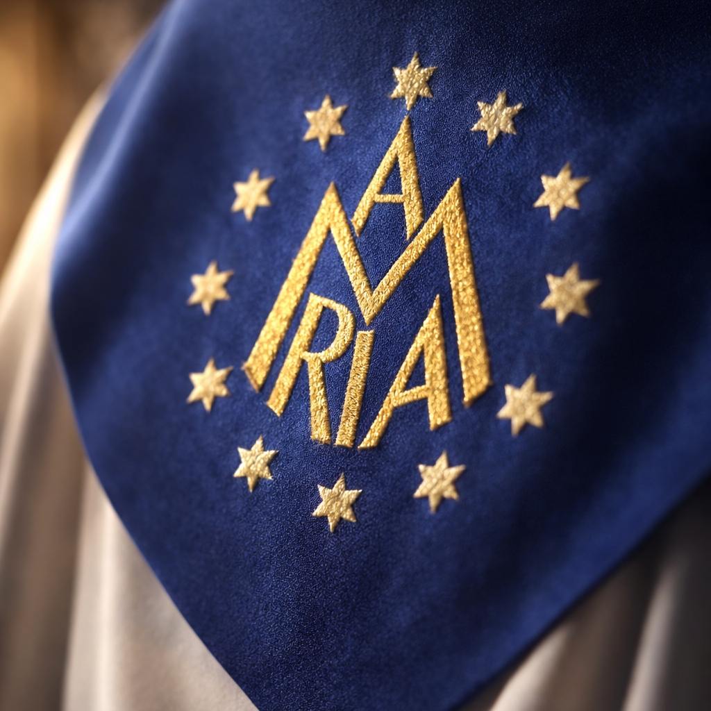 Uroczysta kapa maryjna w kolorze niebieskim, zdobiona bogatym haftem AM, gwiazdami i symboliką korony. Model reprezentacyjny z elegancką klamrą i stułą w komplecie.