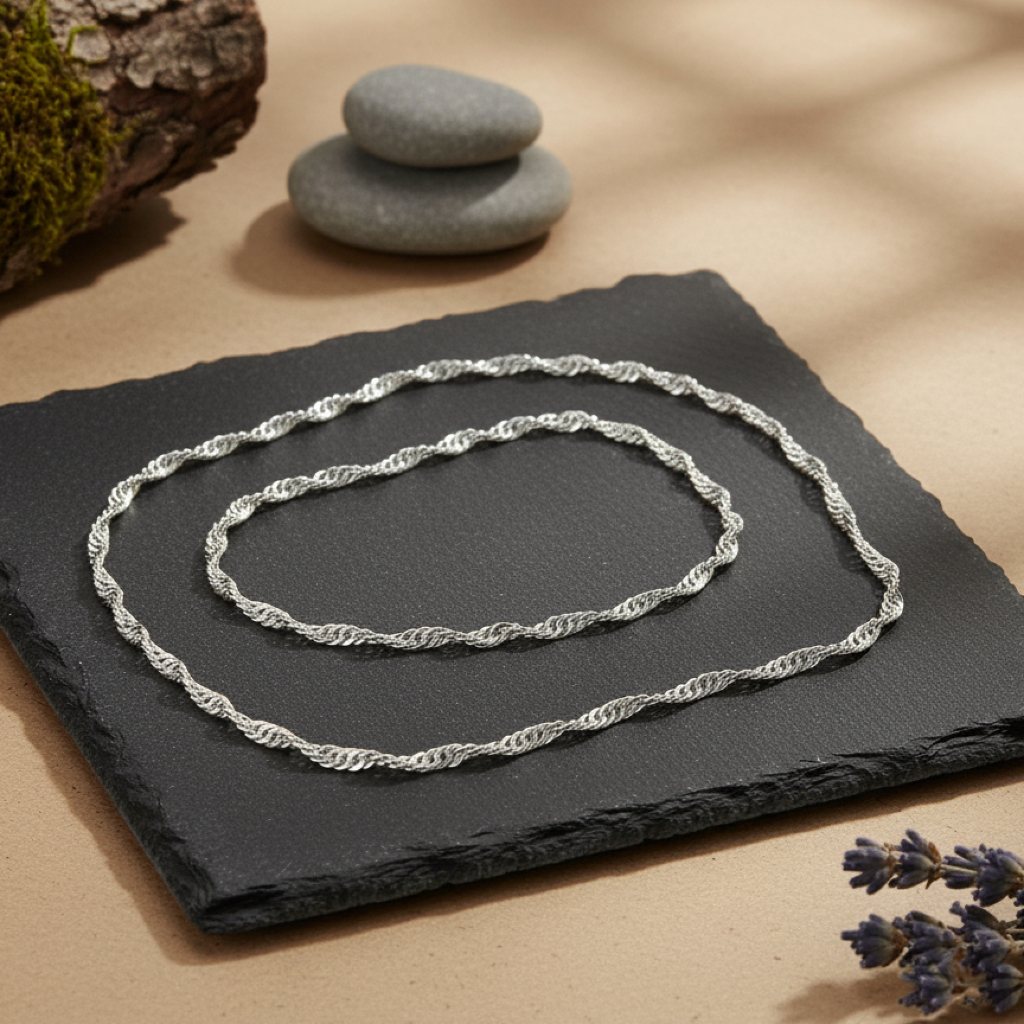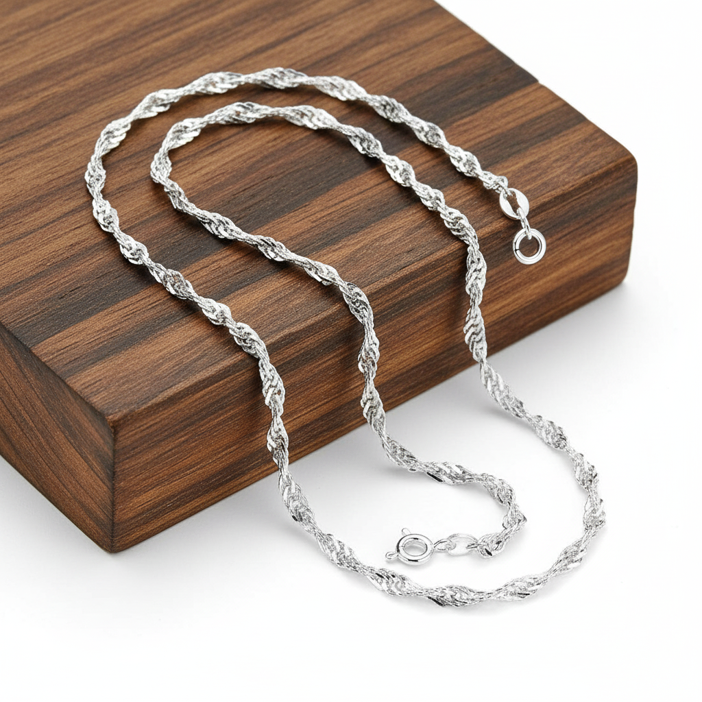 Splot Singapur wyróżnia się skręconymi ogniwami, które efektownie odbijają światło przy każdym ruchu. Jest lekki, a zarazem wytrzymały, co czyni go idealnym wyborem dla osób ceniących elegancję i subtelny styl. To jeden z najchętniej wybieranych wzorów wśród kobiet i młodzieży.