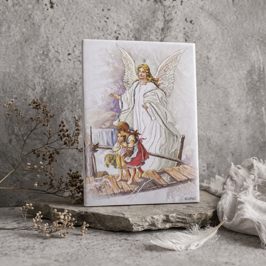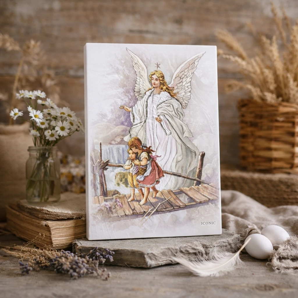Obraz sakralny ICONIC™ – Anioł Stróż na mostku to pełen czułości i spokoju wizerunek przedstawiający Anioła prowadzącego dziecko przez most. To symbol opieki, bezpieczeństwa i Bożej obecności w codziennym życiu. Motyw ten od pokoleń kojarzony jest z troską, ochroną oraz prowadzeniem przez życiowe ścieżki.