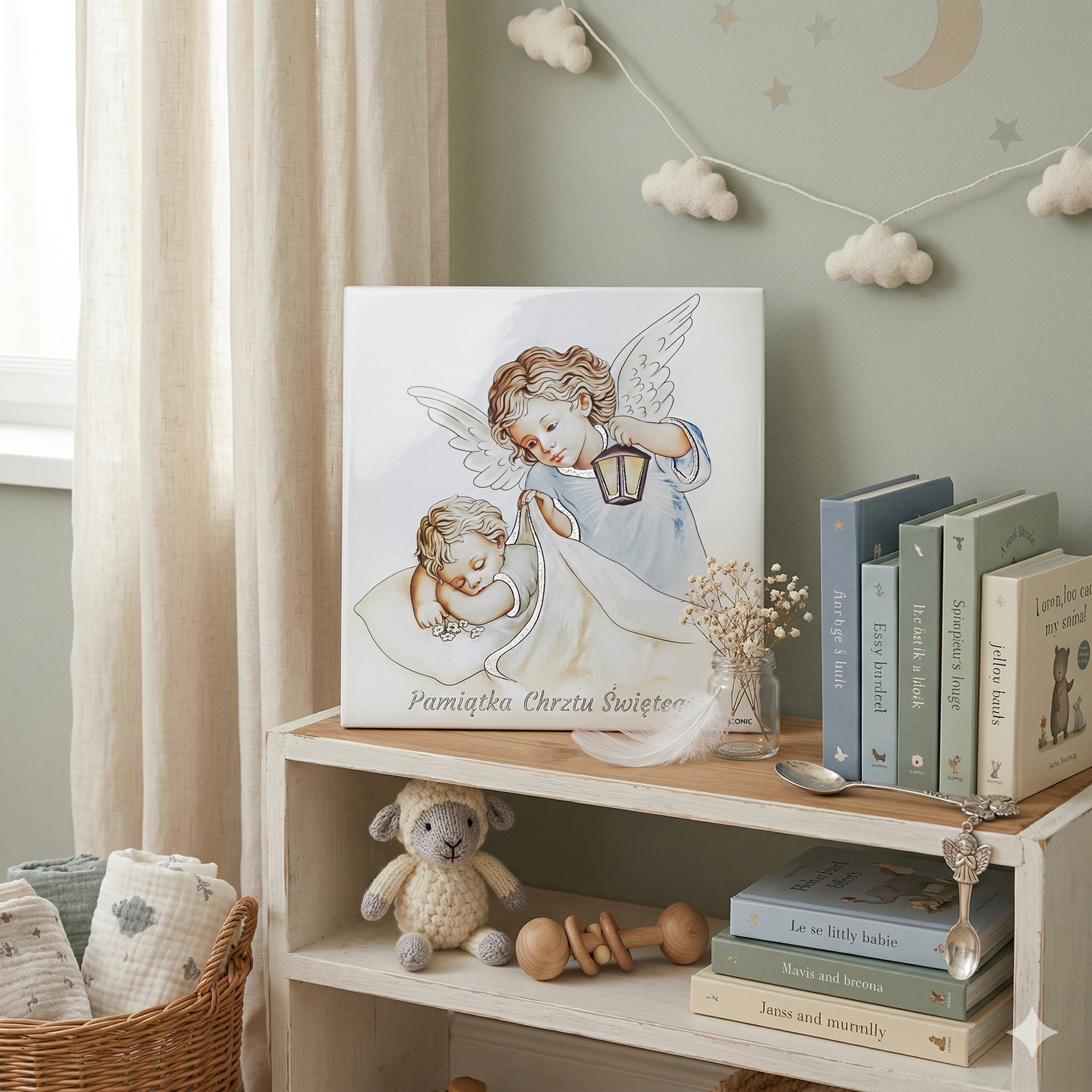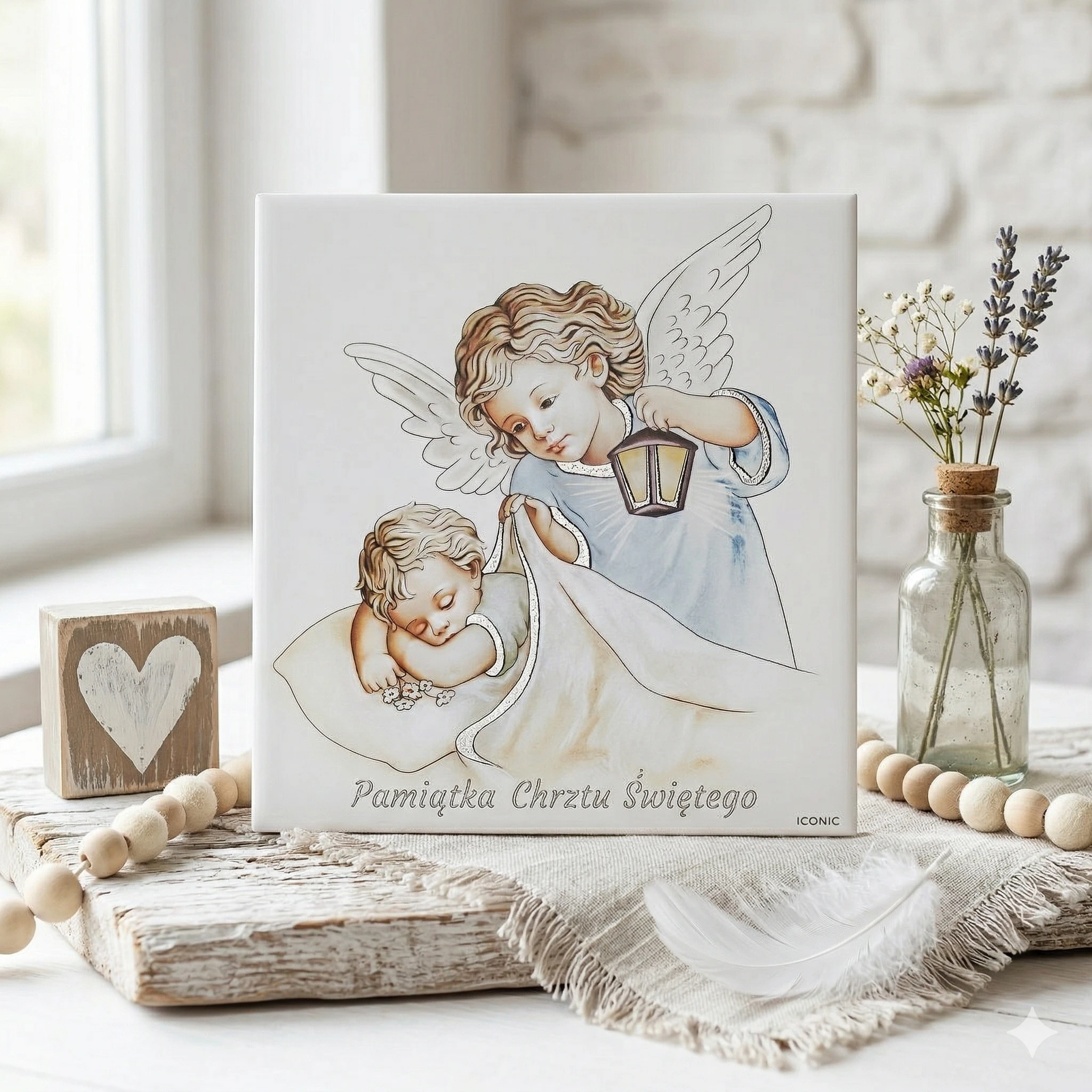 Dodaj tabliczkę z grawerem lub nadruk Ink-Jet z imieniem dziecka, datą Chrztu lub dedykacją. Dzięki temu obraz staje się wyjątkową, osobistą pamiątką.