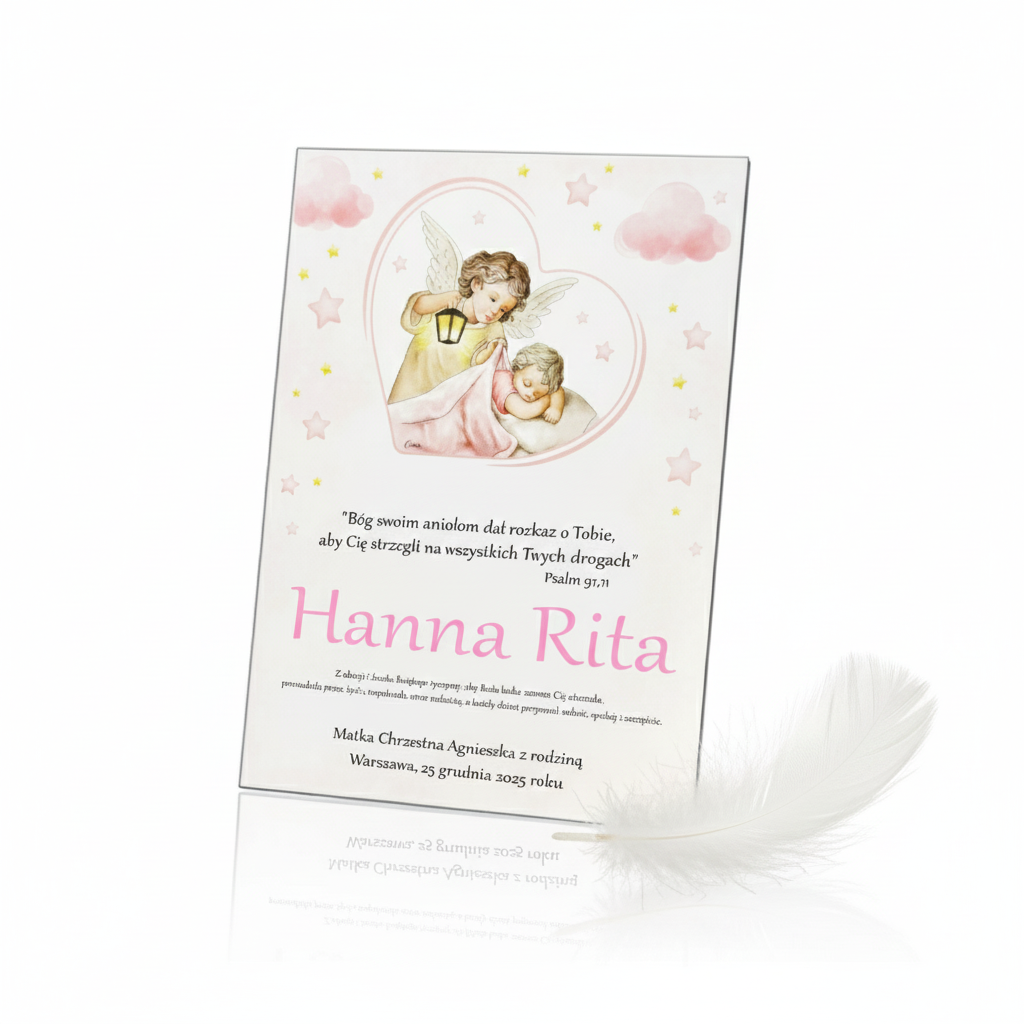 Uroczy obraz sakralny dla dziewczynki z motywem Anioła Stróża czuwającego z latarenką. Wersja Royal Pink 20×25 cm zachwyca delikatnością pastelowych różów i trwałym nadrukiem Ink-Jet. Idealna pamiątka Chrztu Świętego, narodzin i innych chwil pełnych wzruszeń.