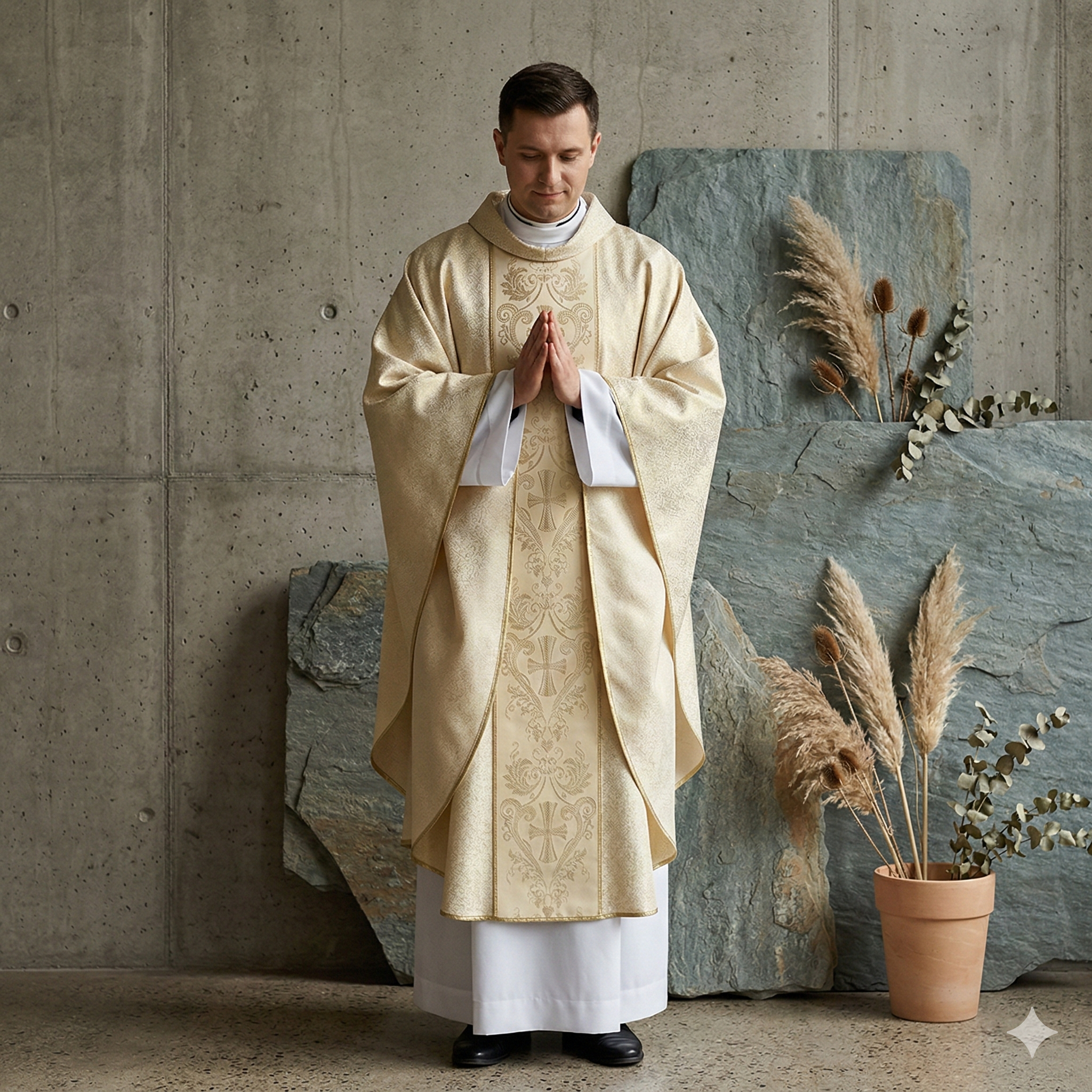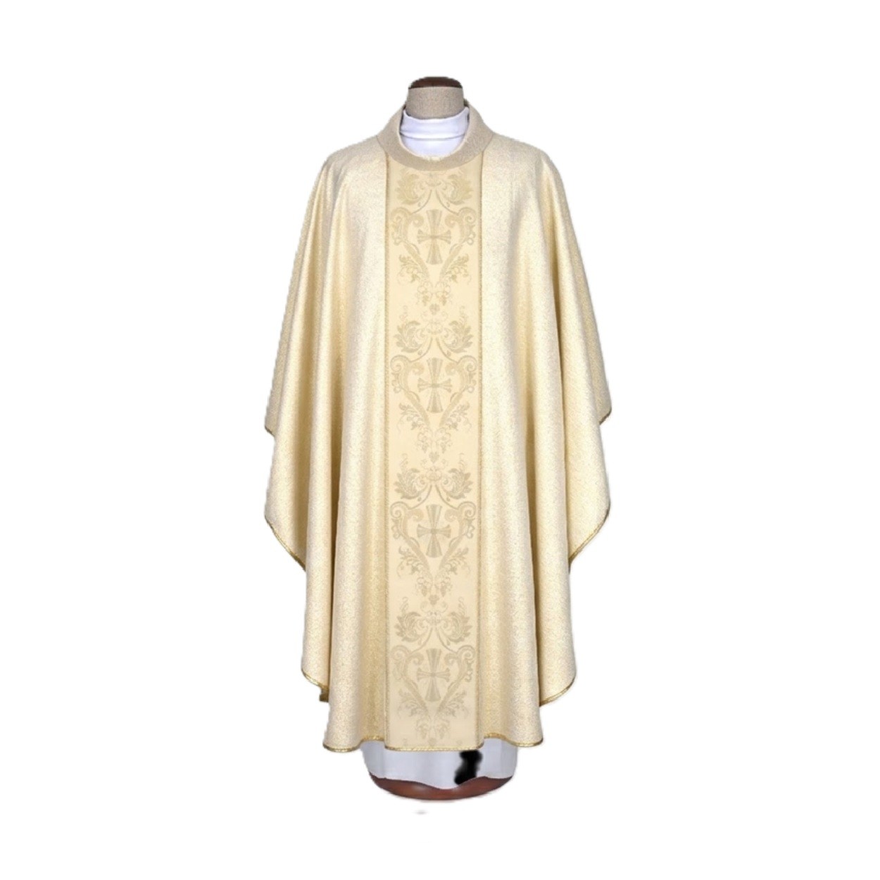Ornat wykonany z lekkiej, brokatowej tkaniny w kolorze jasnego złota, która subtelnie odbija światło i nadaje szacie wyjątkowej elegancji. Jasna tonacja sprawia, że model prezentuje się niezwykle harmonijnie i uroczyście.