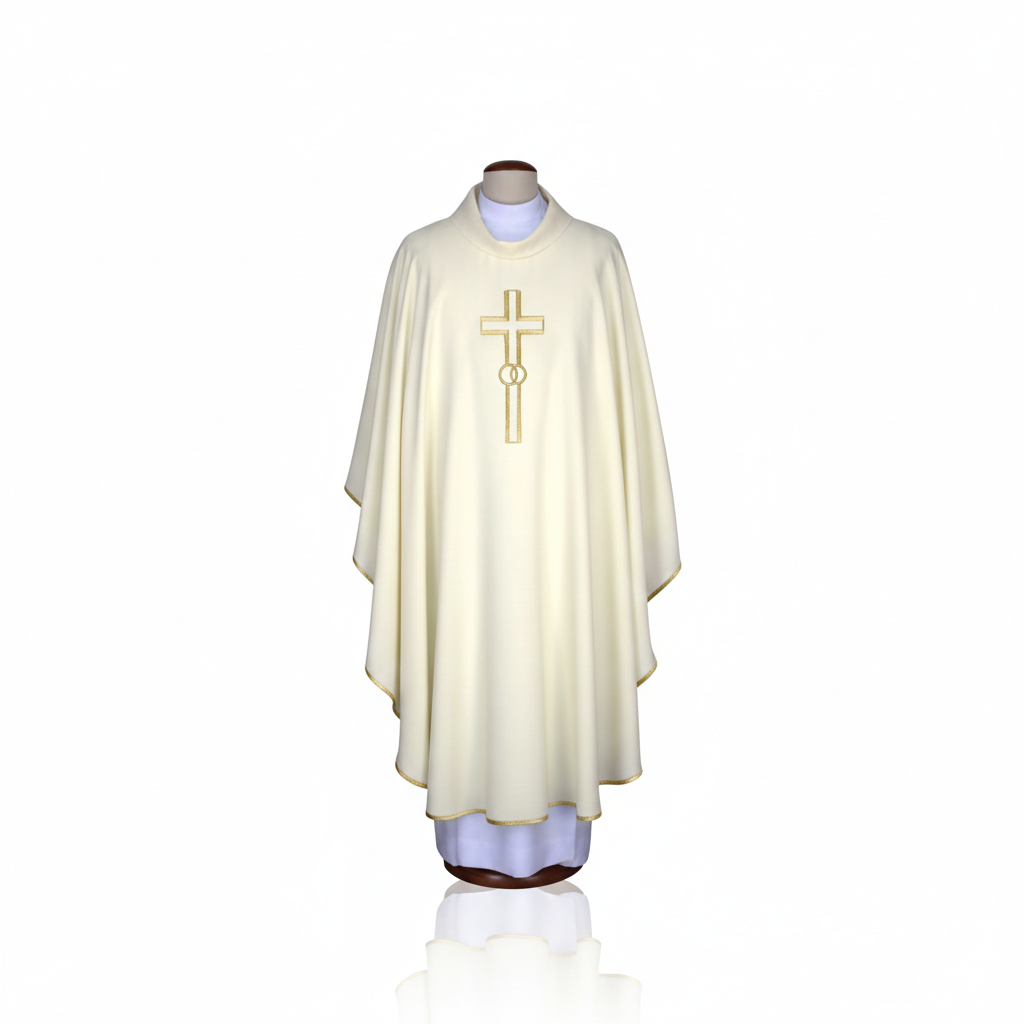 Ornat powstaje z wysokogatunkowych tkanin liturgicznych, zapewniających eleganckie układanie się materiału oraz komfort nawet podczas długiej ceremonii ślubnej.