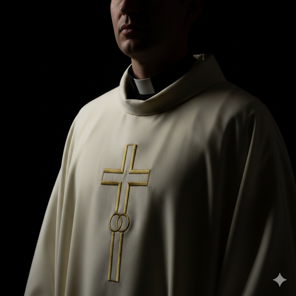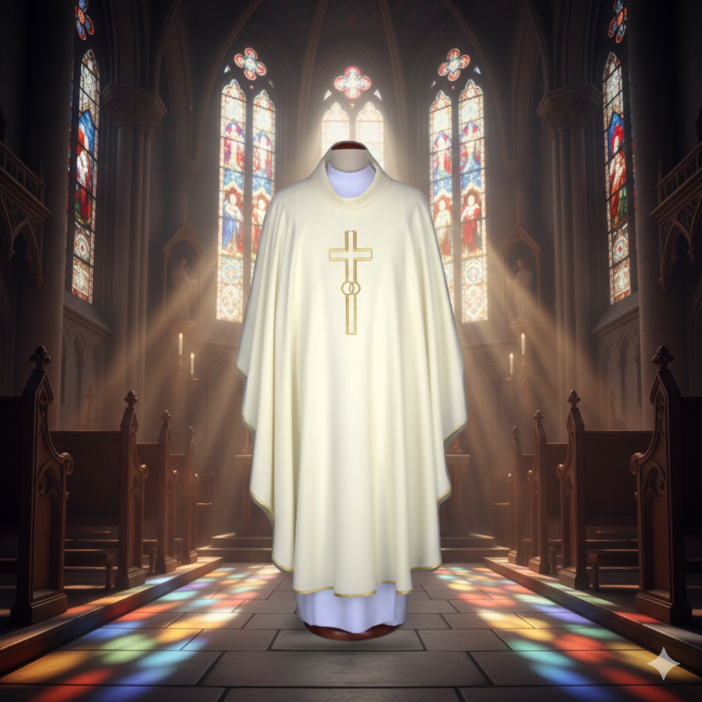 Każdy detal opracowany jest z myślą o teologicznej wymowie i estetyce sakralnej, aby ornat był znakiem łaski i powagi chwili.