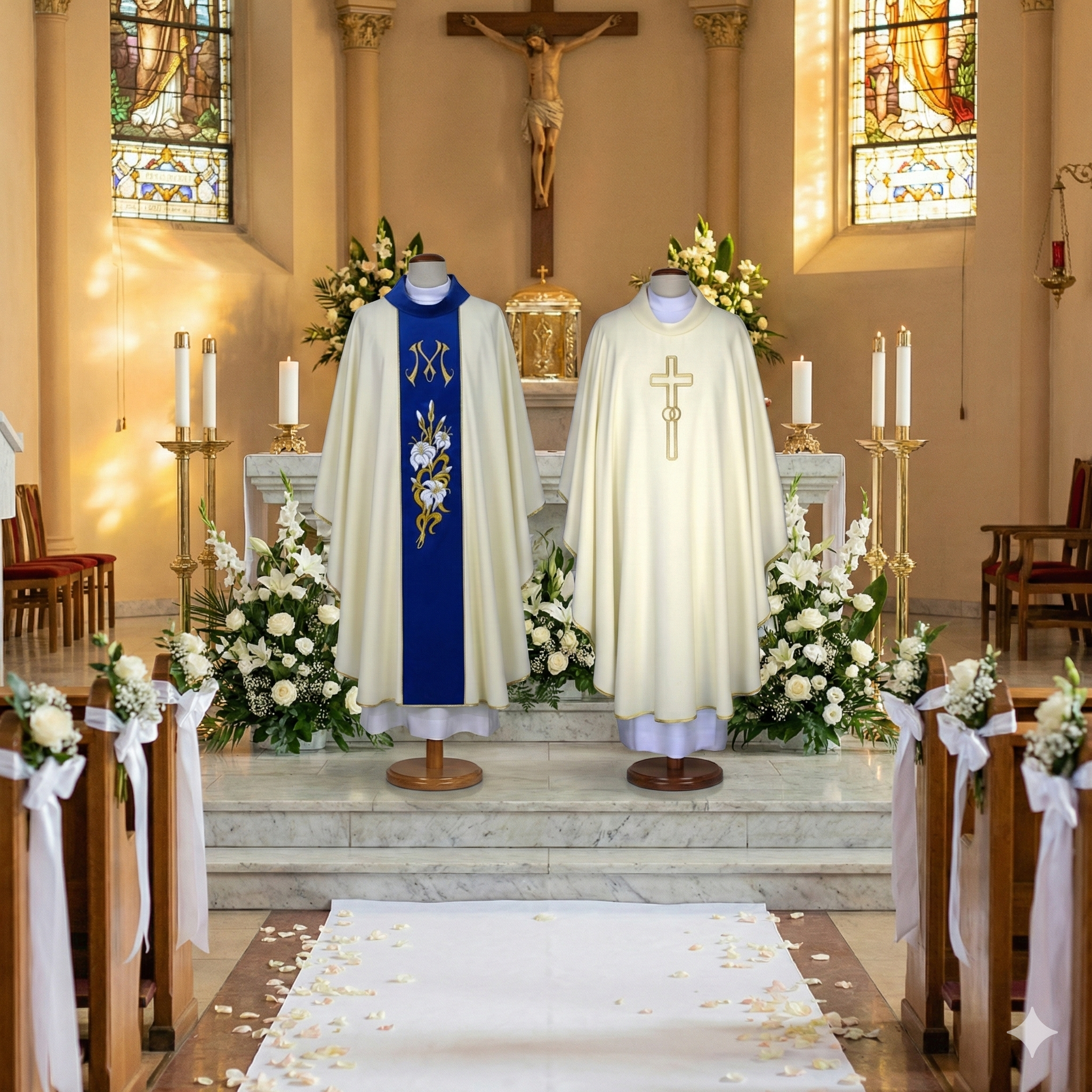 Ornat haftowany z symboliką ślubną podkreśla sakramentalny charakter małżeństwa jako przymierza zawartego wobec Boga. Motywy takie jak splecione obrączki, krzyż, serce, kielich czy delikatne ornamenty roślinne symbolizują jedność, wierność oraz łaskę umacniającą nowożeńców w ich wspólnej drodze.