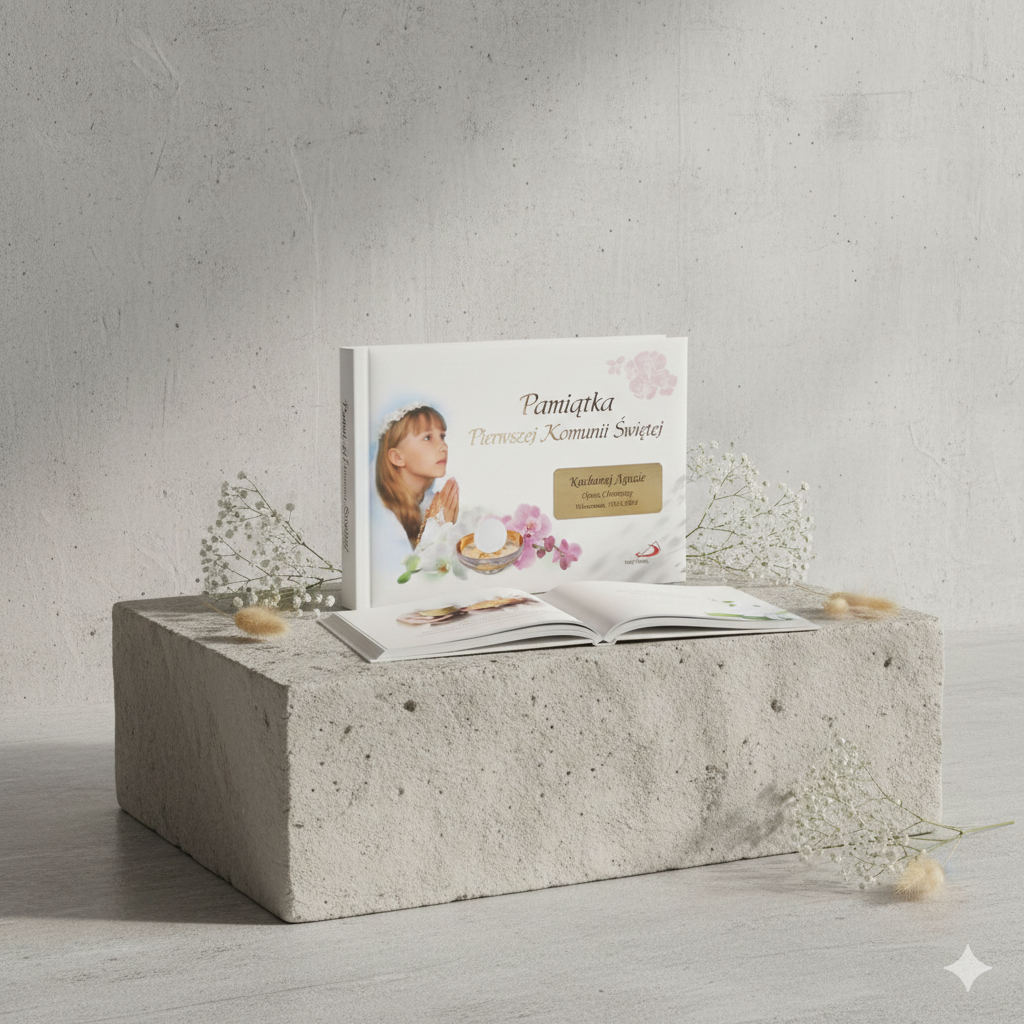 Książki, albumy i pamiątki, które pomagają zachować duchowe i rodzinne wspomnienia Pierwszej Komunii Świętej.