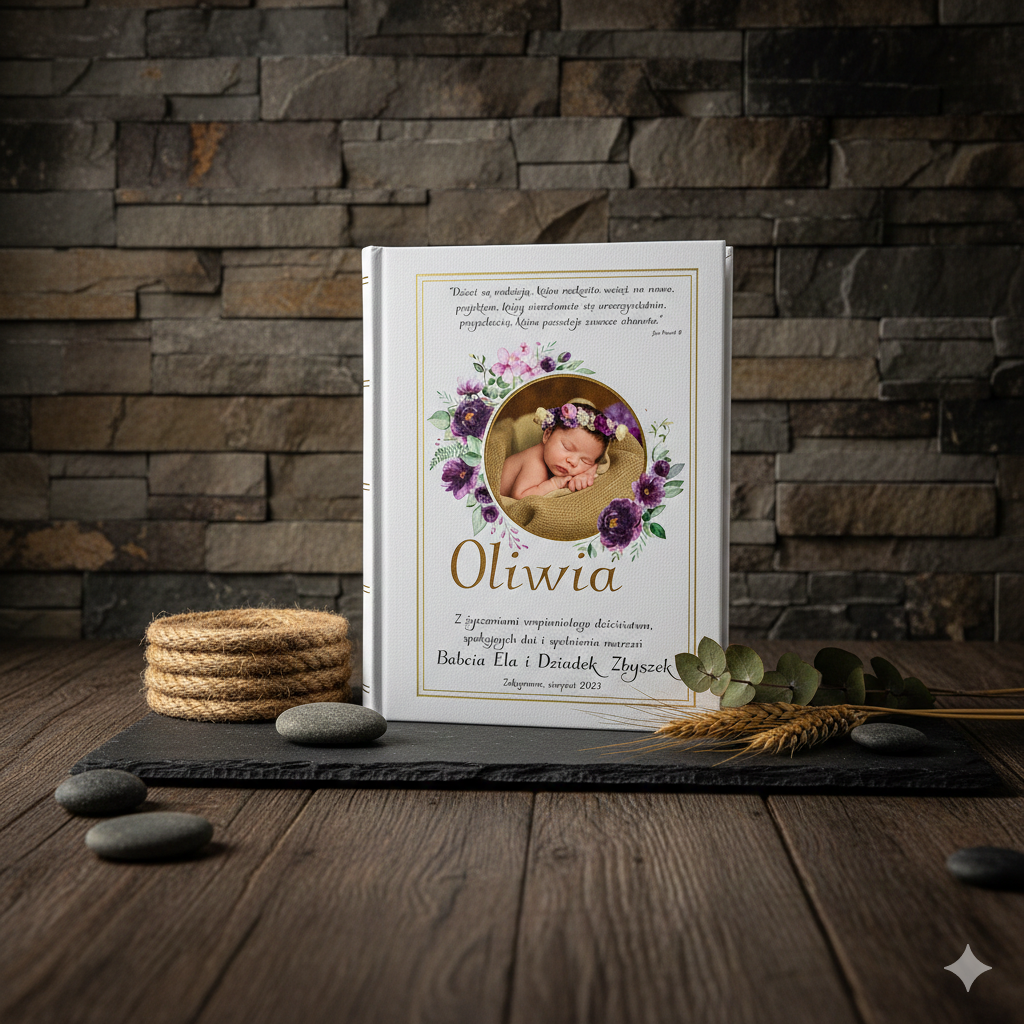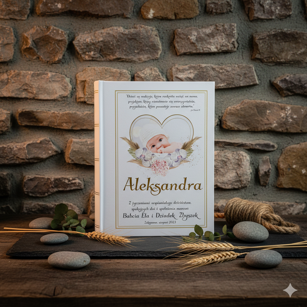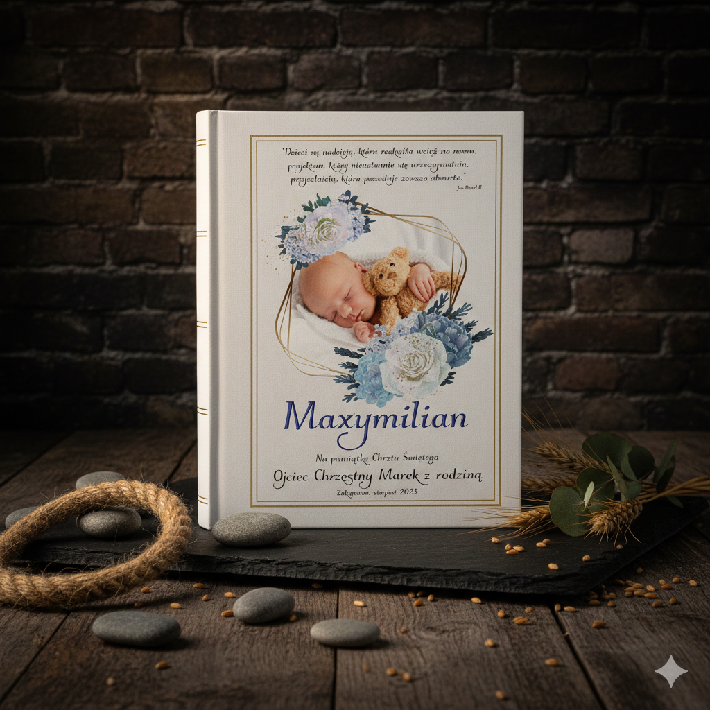 Na okładce można umieścić wybrane zdjęcie dziecka – z narodzin, pierwszych urodzin, Chrztu Świętego lub rodzinnej uroczystości. Uzupełniona o dedykację z imieniem i datą, tworzy unikatową kompozycję, której nie znajdzie się w żadnym innym domu.