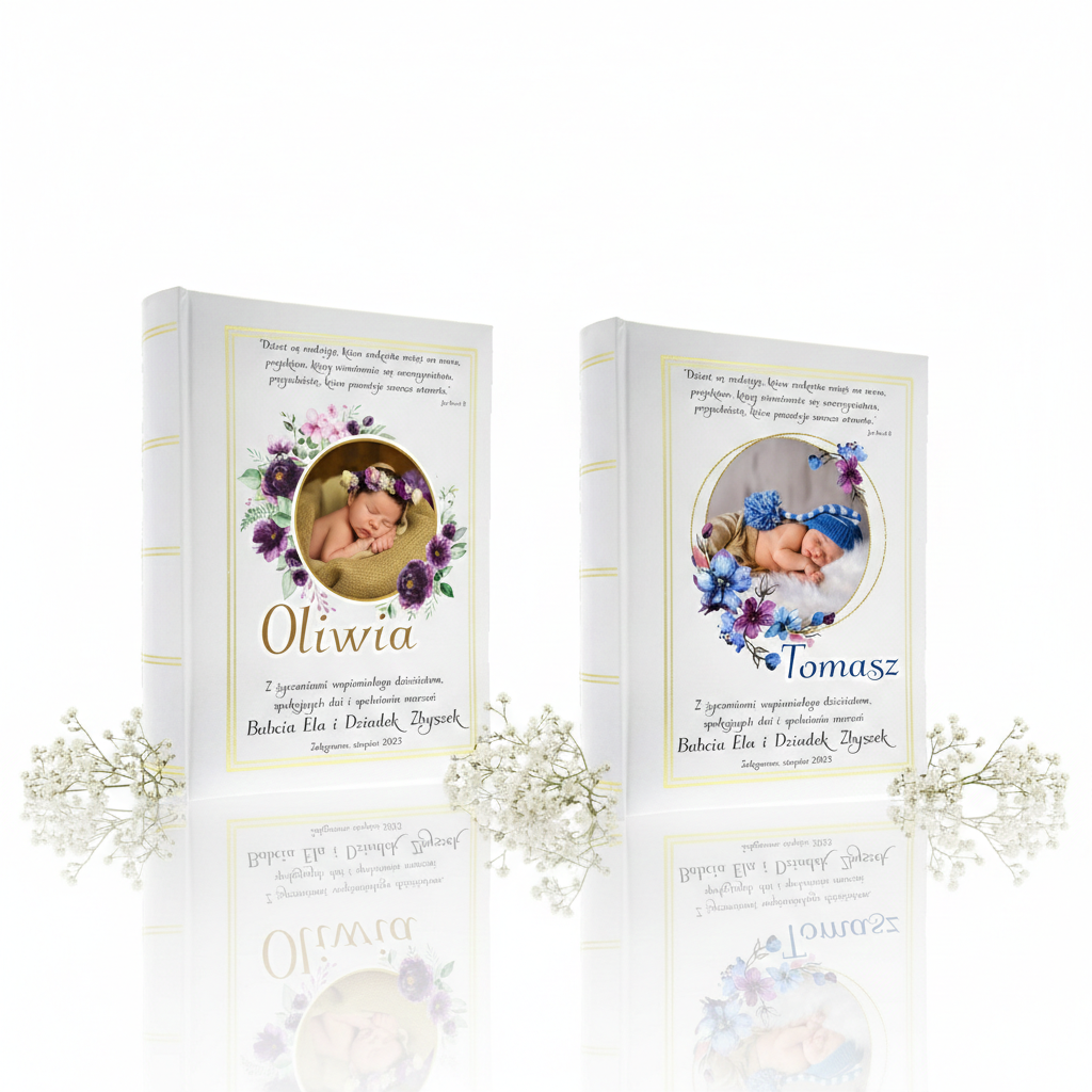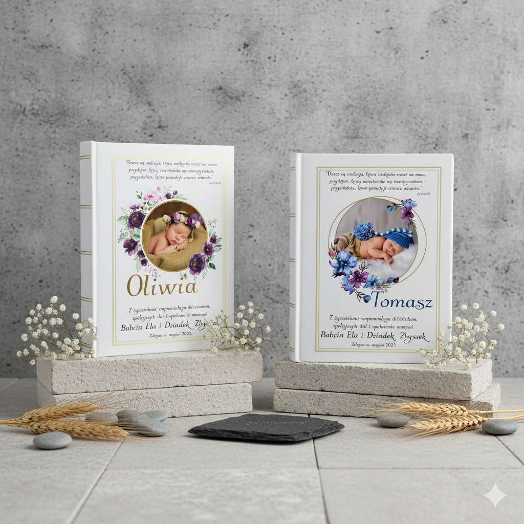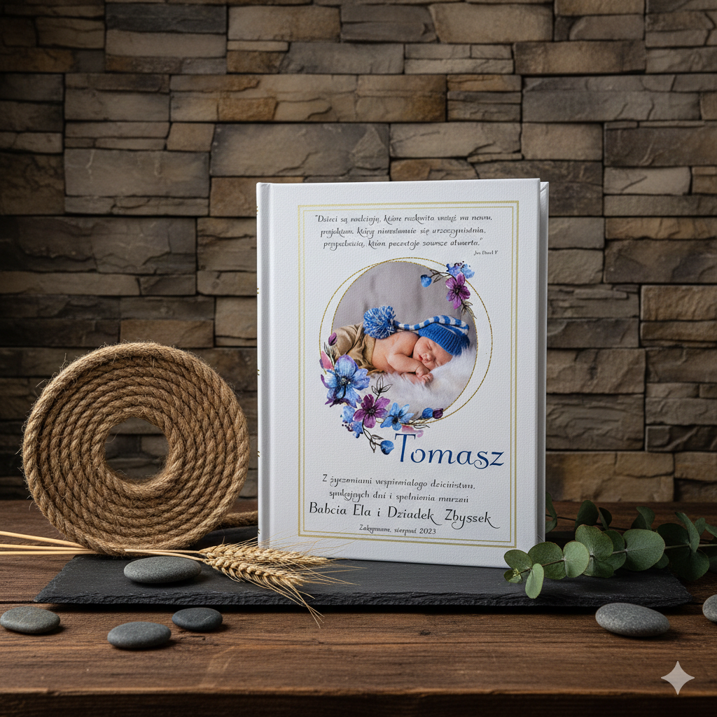 Na okładce można umieścić wybrane zdjęcie dziecka – z narodzin, pierwszych urodzin, Chrztu Świętego lub rodzinnej uroczystości. Uzupełniona o dedykację z imieniem i datą, tworzy unikatową kompozycję, której nie znajdzie się w żadnym innym domu.