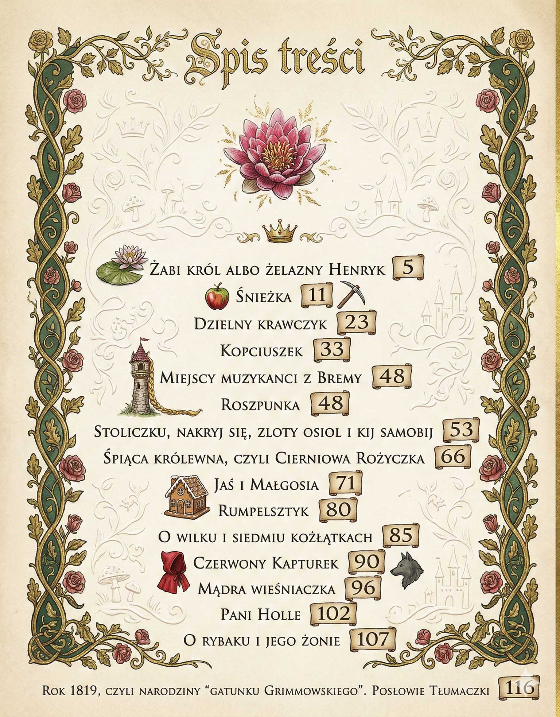 „Baśnie wybrane braci Grimm na podstawie II wydania z 1819 roku” to wyjątkowa edycja klasycznych opowieści w całkowicie nowym przekładzie, opartym na jednym z najstarszych, nieskażonych dydaktycznymi zmianami zbiorów. W tym wydaniu baśnie zachowały naturalną prostotę ludowego przekazu, połączoną z bogactwem znaczeń i emocji.