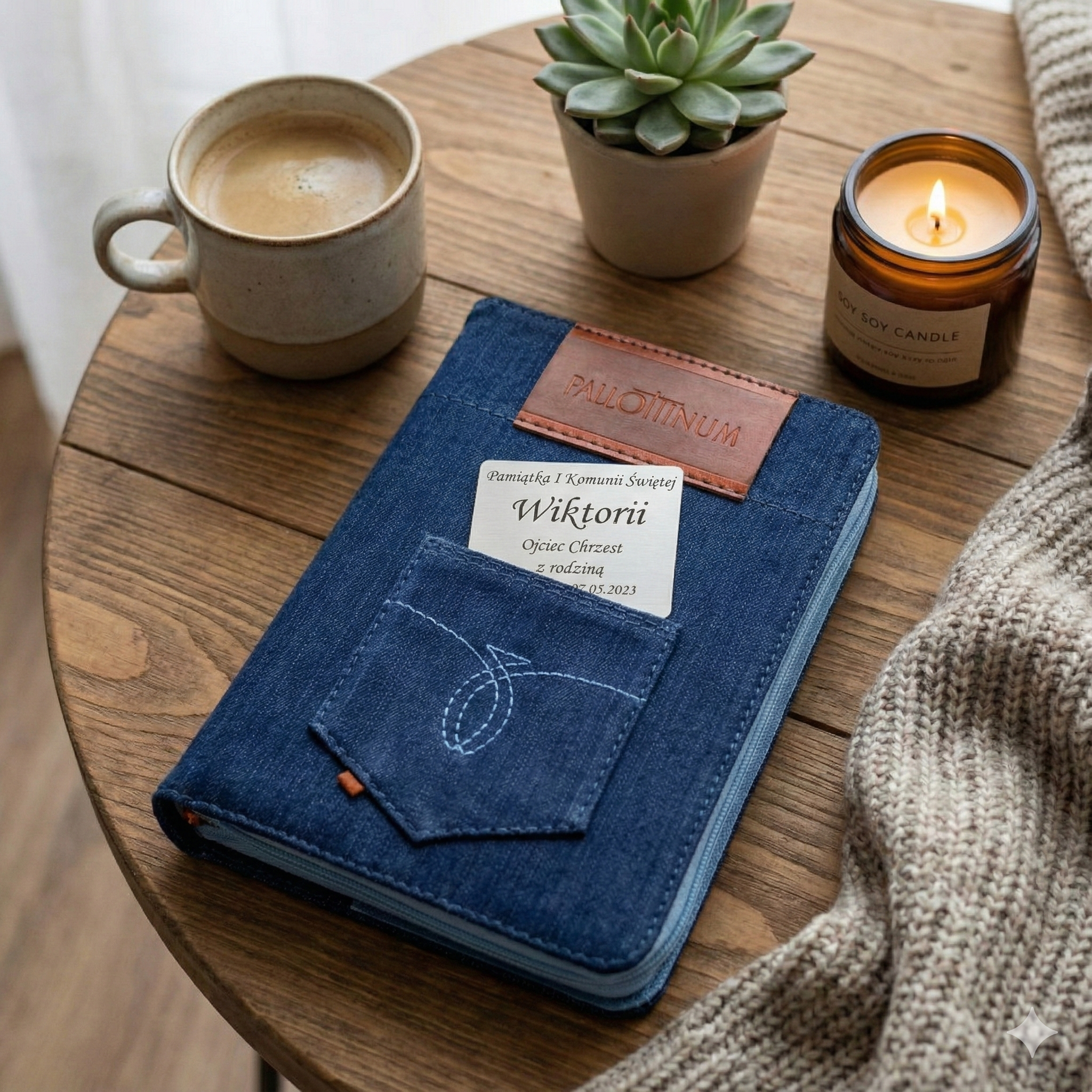 Na froncie znajduje się praktyczna kieszeń, która nadaje całości oryginalny, „podróżny” charakter i może pełnić funkcję miejsca na pamiątkę lub dedykację.