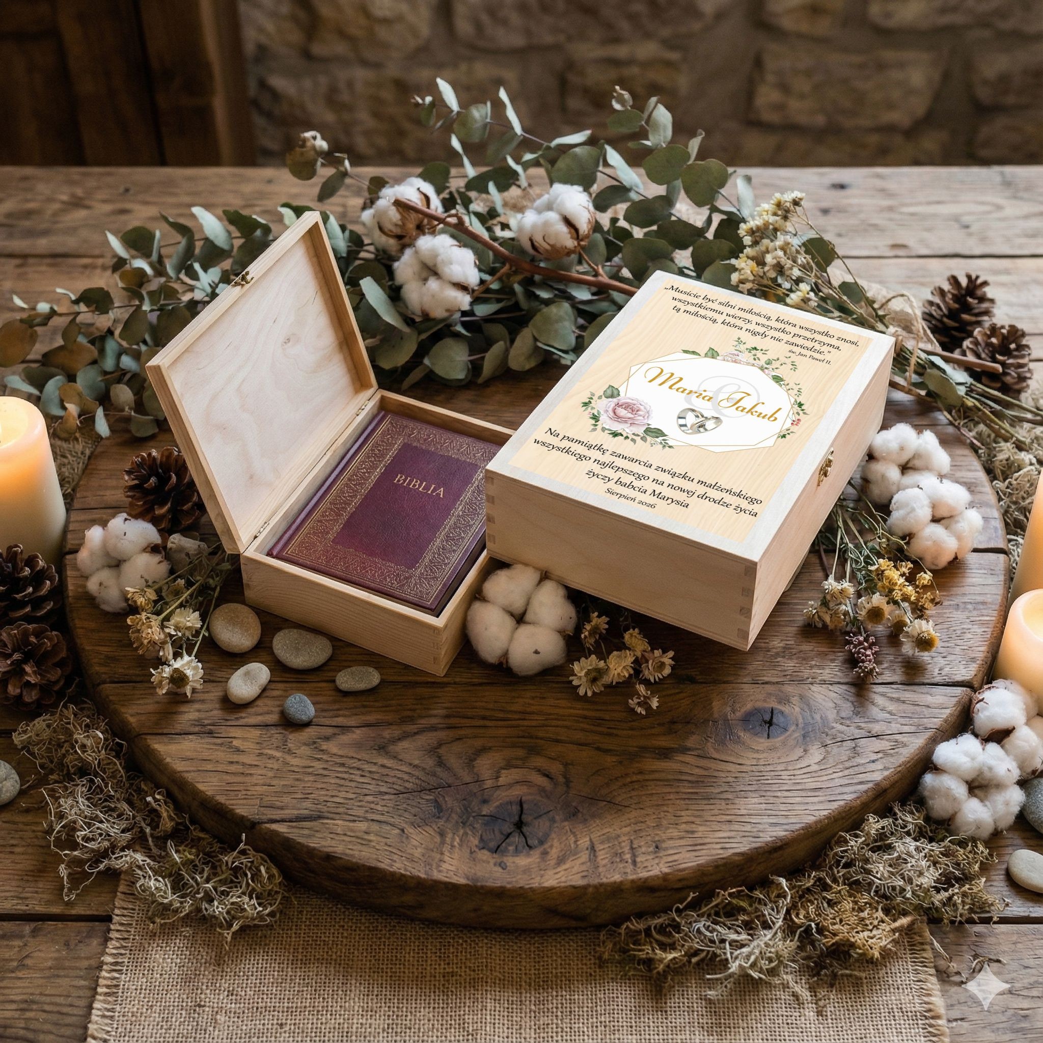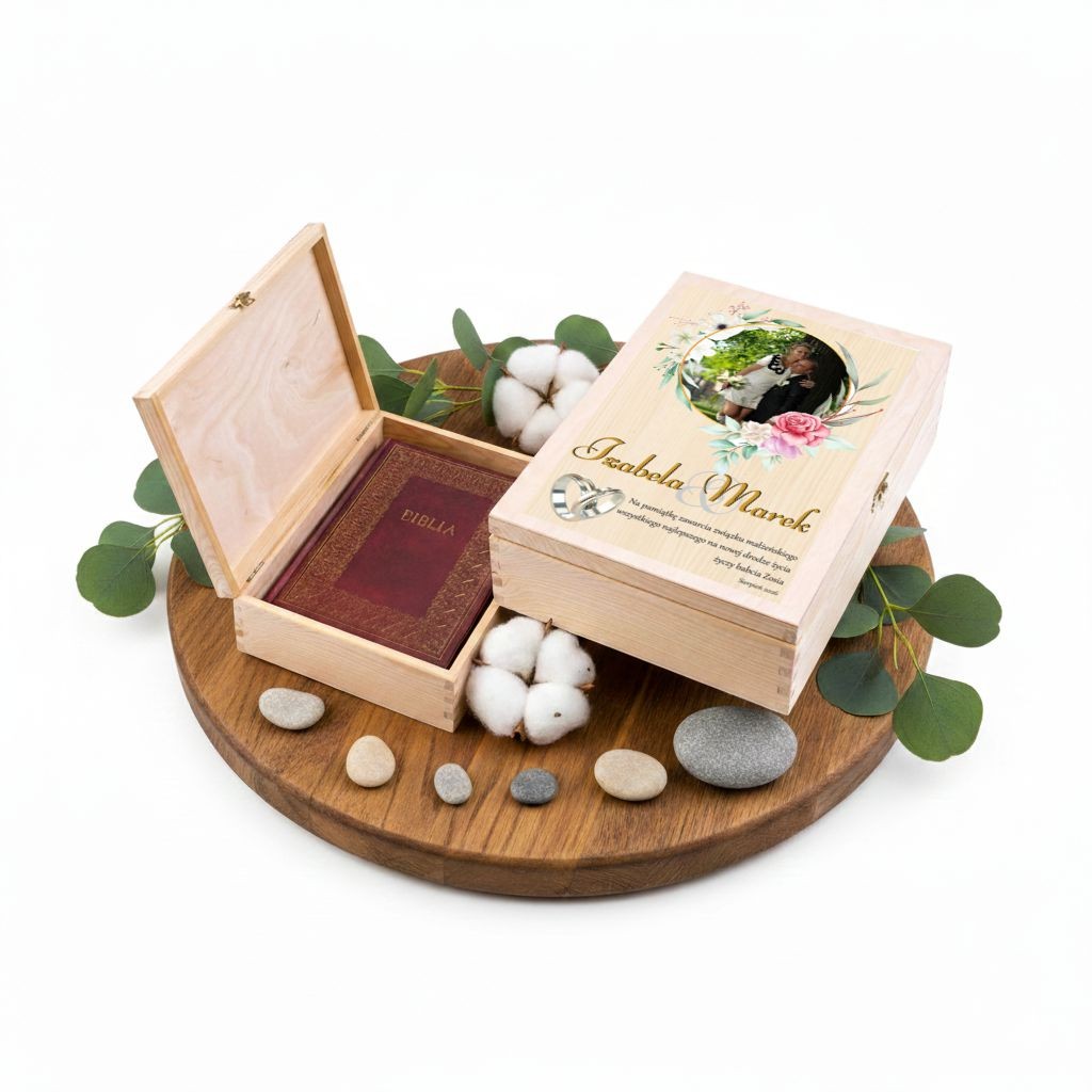 Do Biblii dołączono drewniane pudełko EKO ♻ wykonane z jasnego, naturalnego drewna. Wieko zdobione jest nadrukiem z personalizowaną treścią, dopasowaną do okazji Sakramentu Małżeństwa.