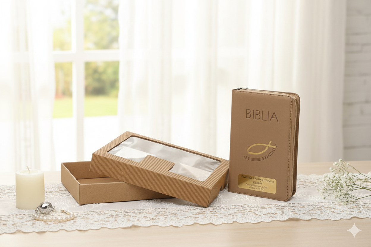 Na froncie oprawy przewidziano miejsce na grawerowaną dedykację – imię, datę lub osobisty cytat. Dzięki temu Twoja Biblia stanie się niepowtarzalnym prezentem o duchowej i pamiątkowej wartości, idealnym z okazji Chrztu, Komunii, Bierzmowania, Ślubu lub jubileuszu.