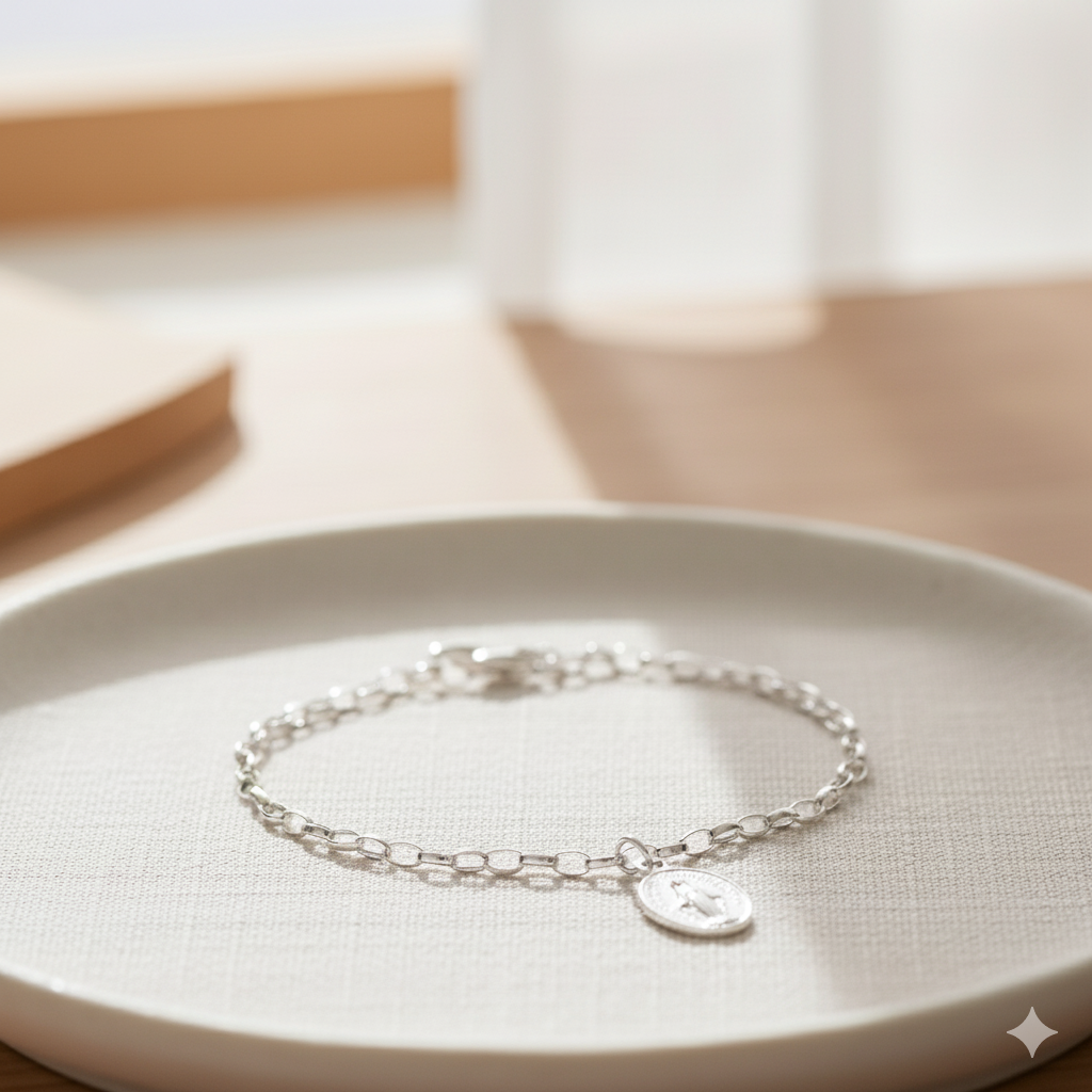 Elegancka i subtelna bransoletka srebrna z Cudownym Medalikiem to wyjątkowy znak zawierzenia Matce Bożej – symbol wiary, nadziei i duchowej opieki. Nawiązuje do praktyki Zawierzeń Maryjnych, w których wierni oddają swoje życie, intencje i troski pod matczyną opiekę Maryi, prosząc o jej wstawiennictwo u Boga.