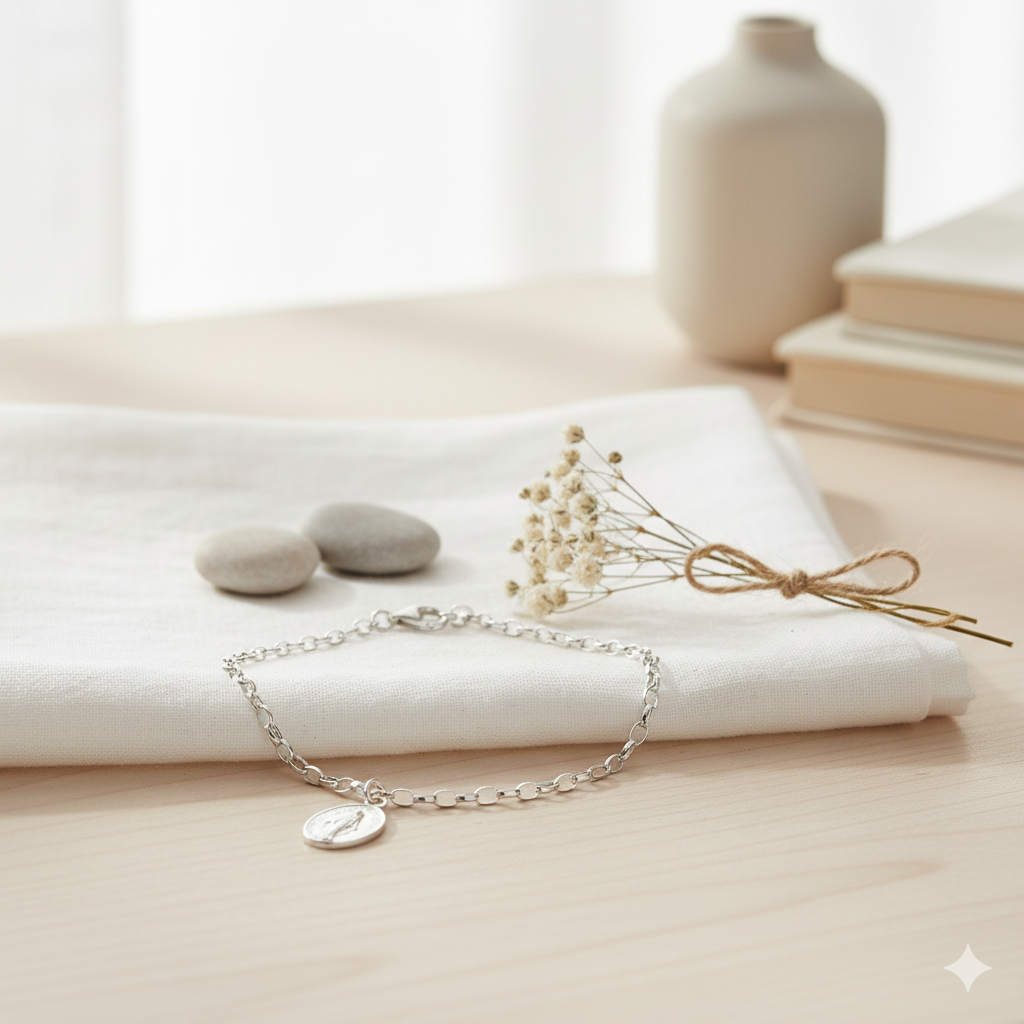 Bransoletka wykonana ze srebra próby 925, o wadze 3,8 g. Minimalistyczna forma i delikatny medalik czynią ją subtelnym, a zarazem wymownym dodatkiem. To idealny wybór dla osób pragnących nosić przy sobie znak zawierzenia i modlitwy w każdym momencie dnia.