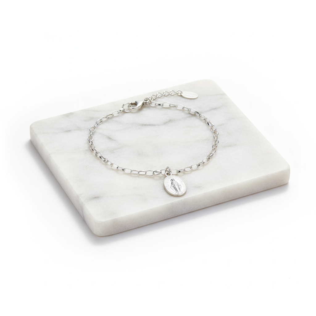 Srebrna bransoletka „Zawierzenia Maryi” z Cudownym Medalikiem – symbol wiary, oddania i opieki Matki Bożej. Srebro pr. 925, waga 3,8 g.
