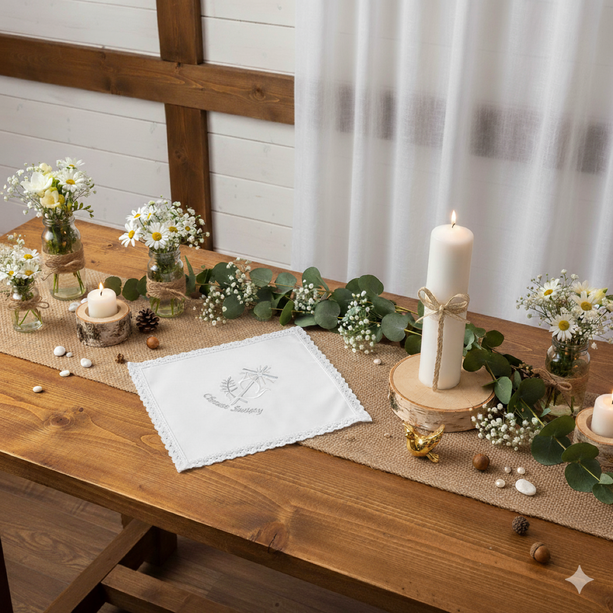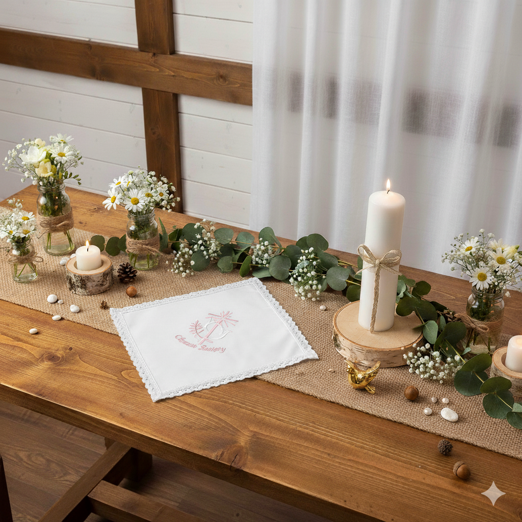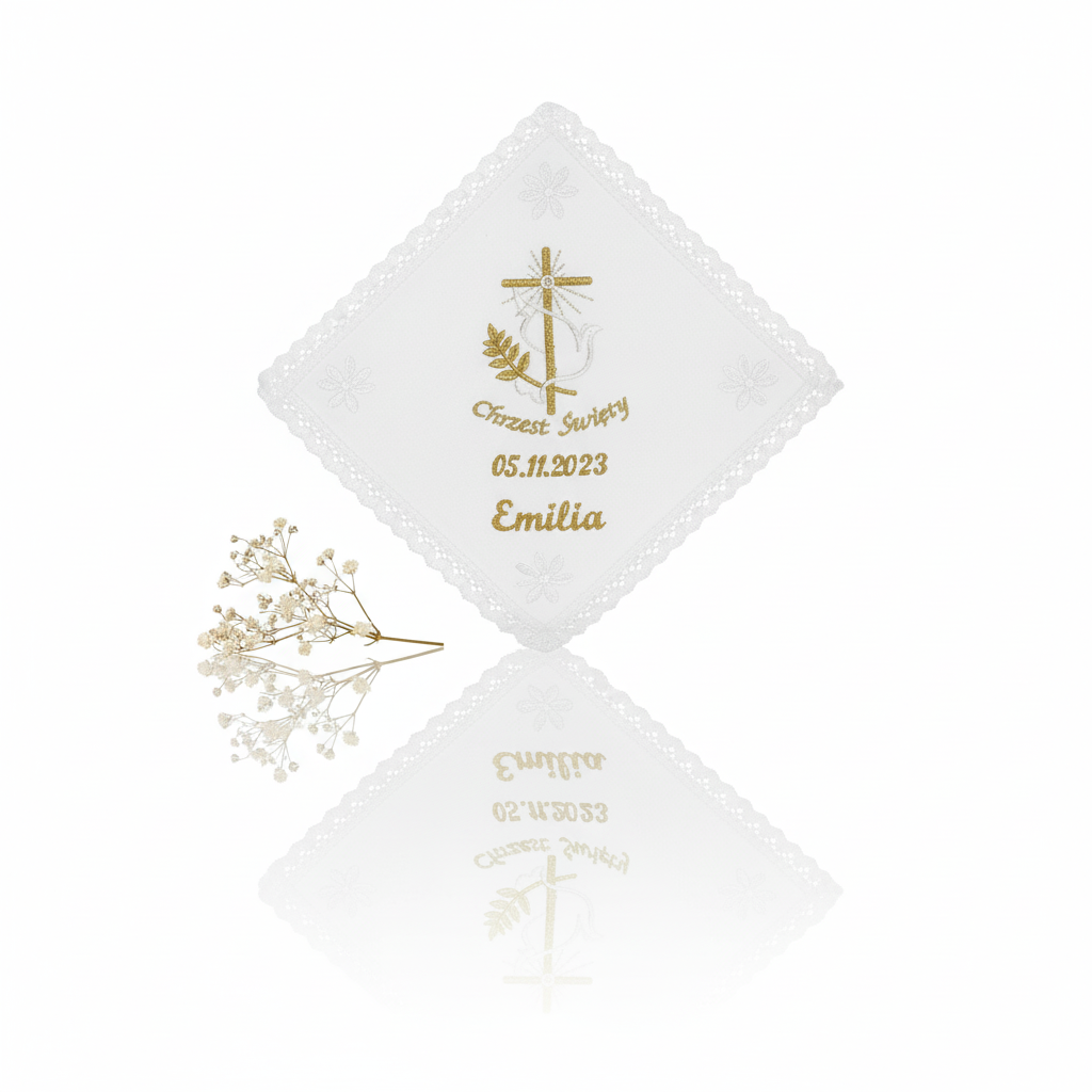 Istnieje możliwość personalizacji poprzez haft imienia dziecka oraz daty Chrztu Świętego. Dzięki temu chusta staje się niepowtarzalną, osobistą pamiątką o głębokim znaczeniu duchowym i rodzinnym.