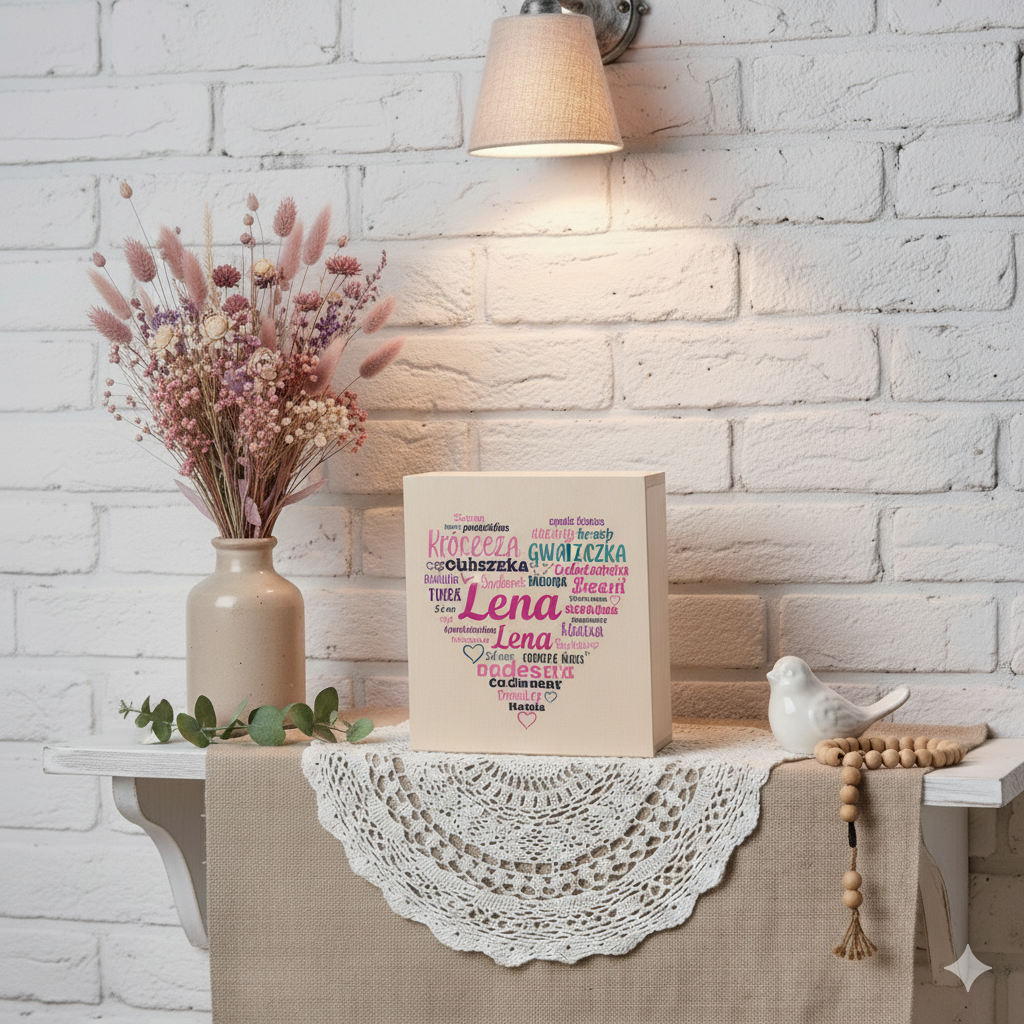 Każde pudełko tworzymy indywidualnie z metryczką wykonaną w druku cyfrowym w technologii Ink-Jet. Dzięki temu kolory są nasycone, odporne na blaknięcie, a detale pozostają czytelne przez długie lata. Personalizacja obejmuje imię dziecka, datę, godzinę i wagę urodzenia, a także krótką dedykację lub cytat.