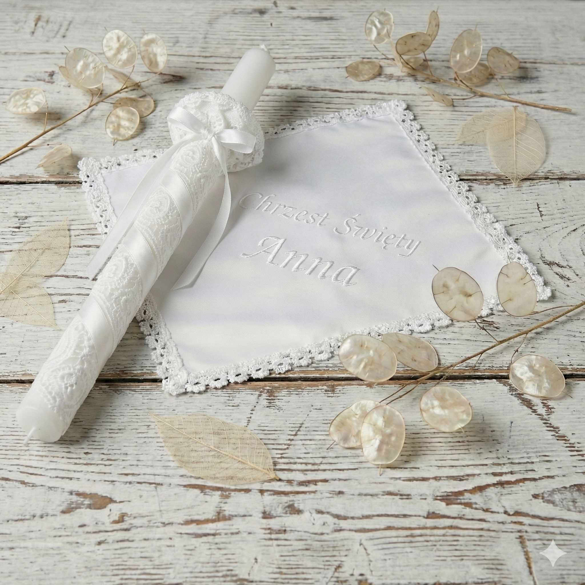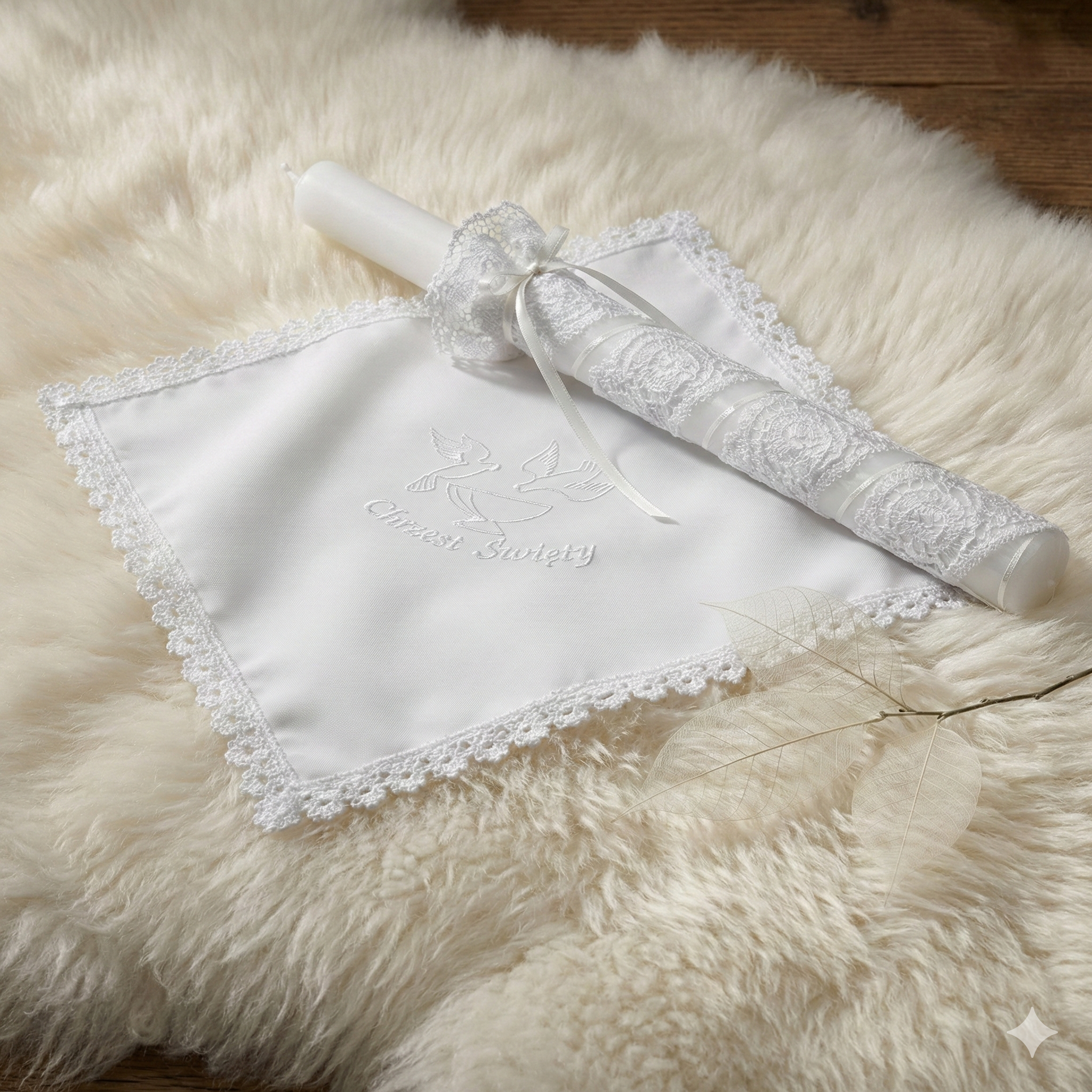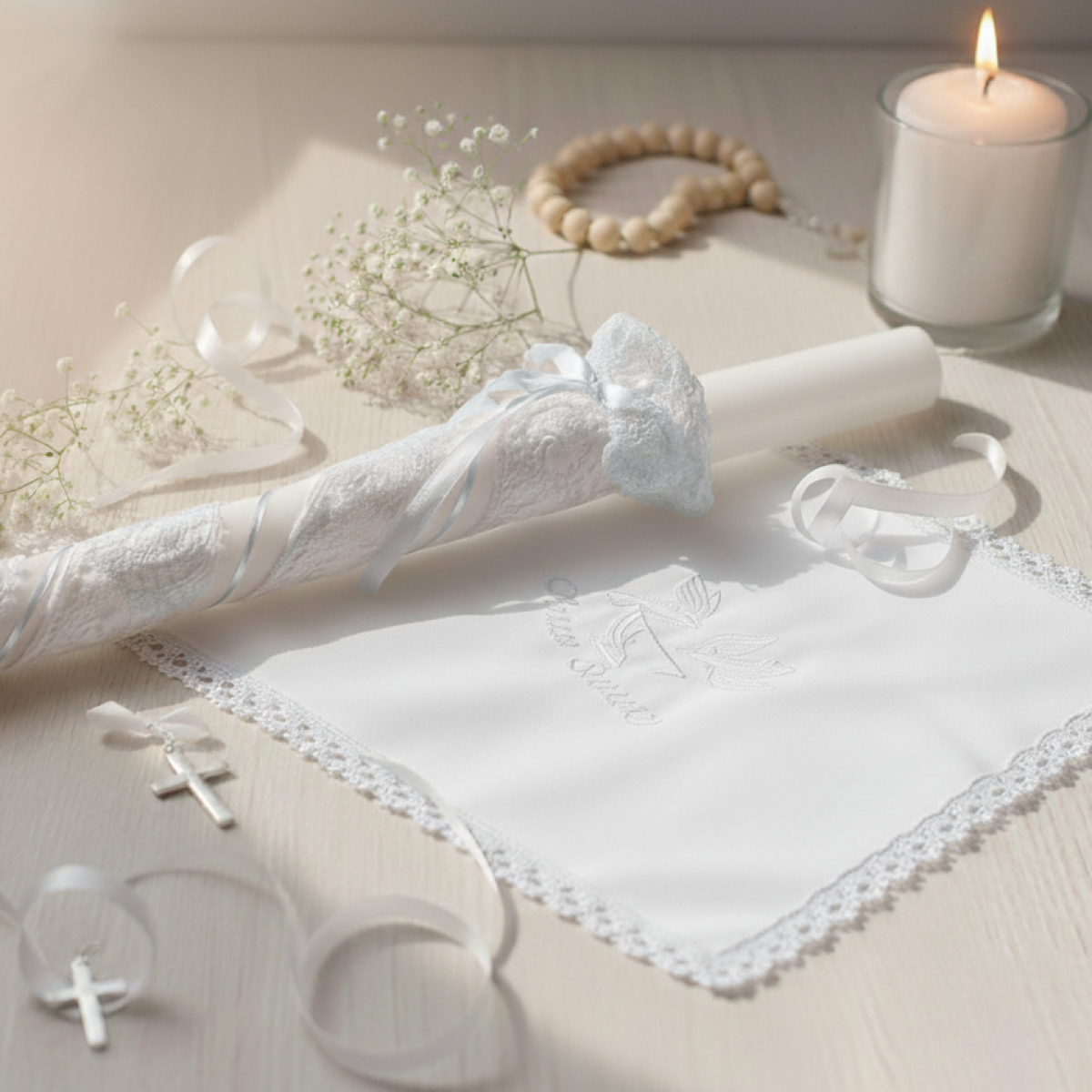 - Świeca chrzcielna – symbol światła Chrystusa i nowego życia