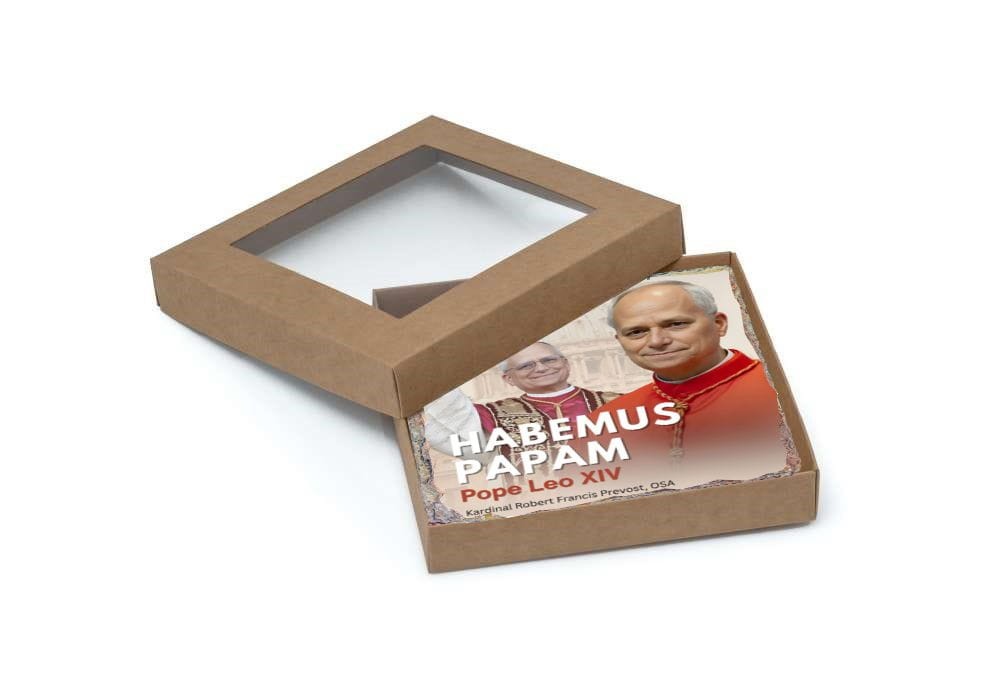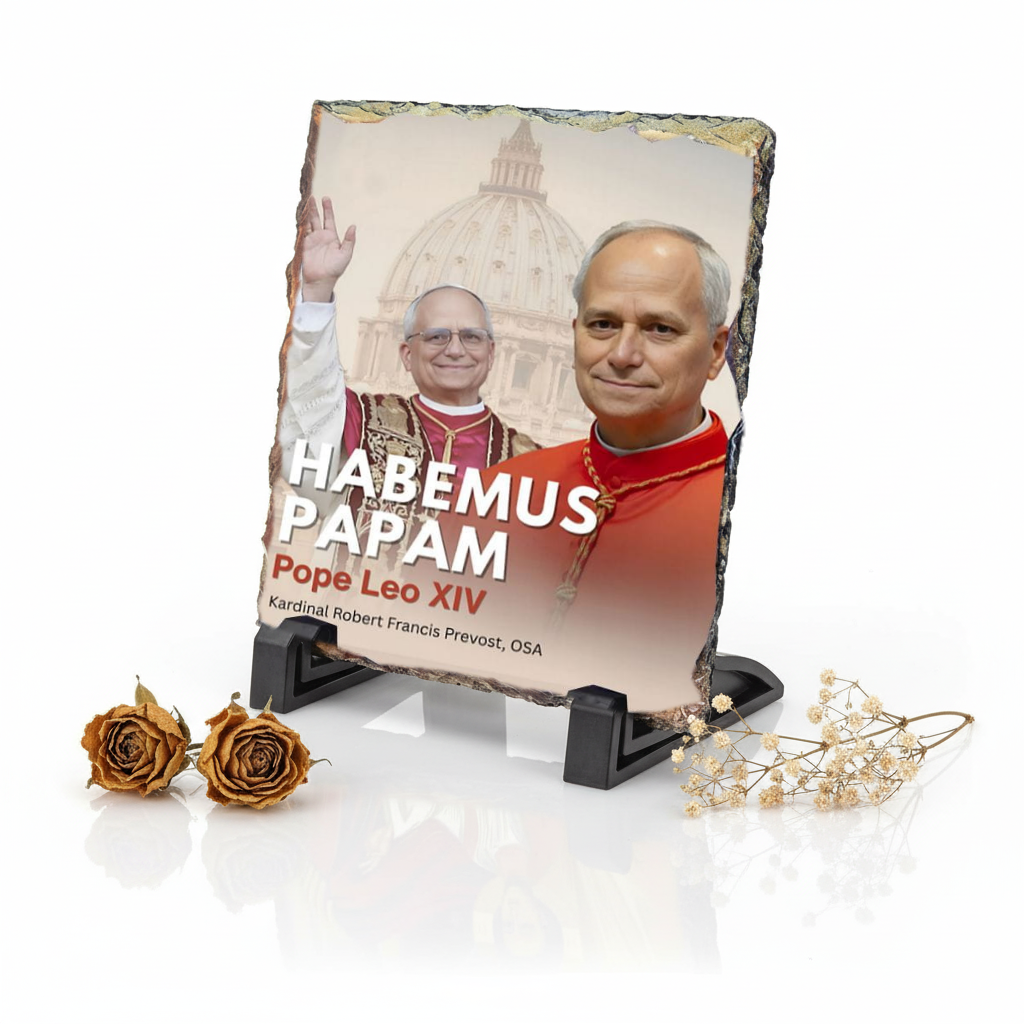 Obrazek religijny na granicie z wizerunkiem Papieża Leona XIV (Roberta Prevosta) wraz z inspirującym cytatem o nadziei.