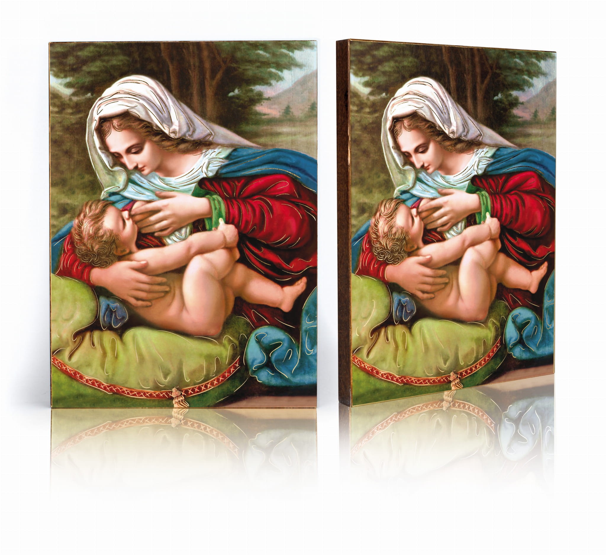 Zastosowana technologia nanoszenia obrazu na drewno pozwala zachować harmonię barw, subtelność przejść tonalnych oraz czytelność detali, z poszanowaniem klasycznego kanonu ikonograficznego.