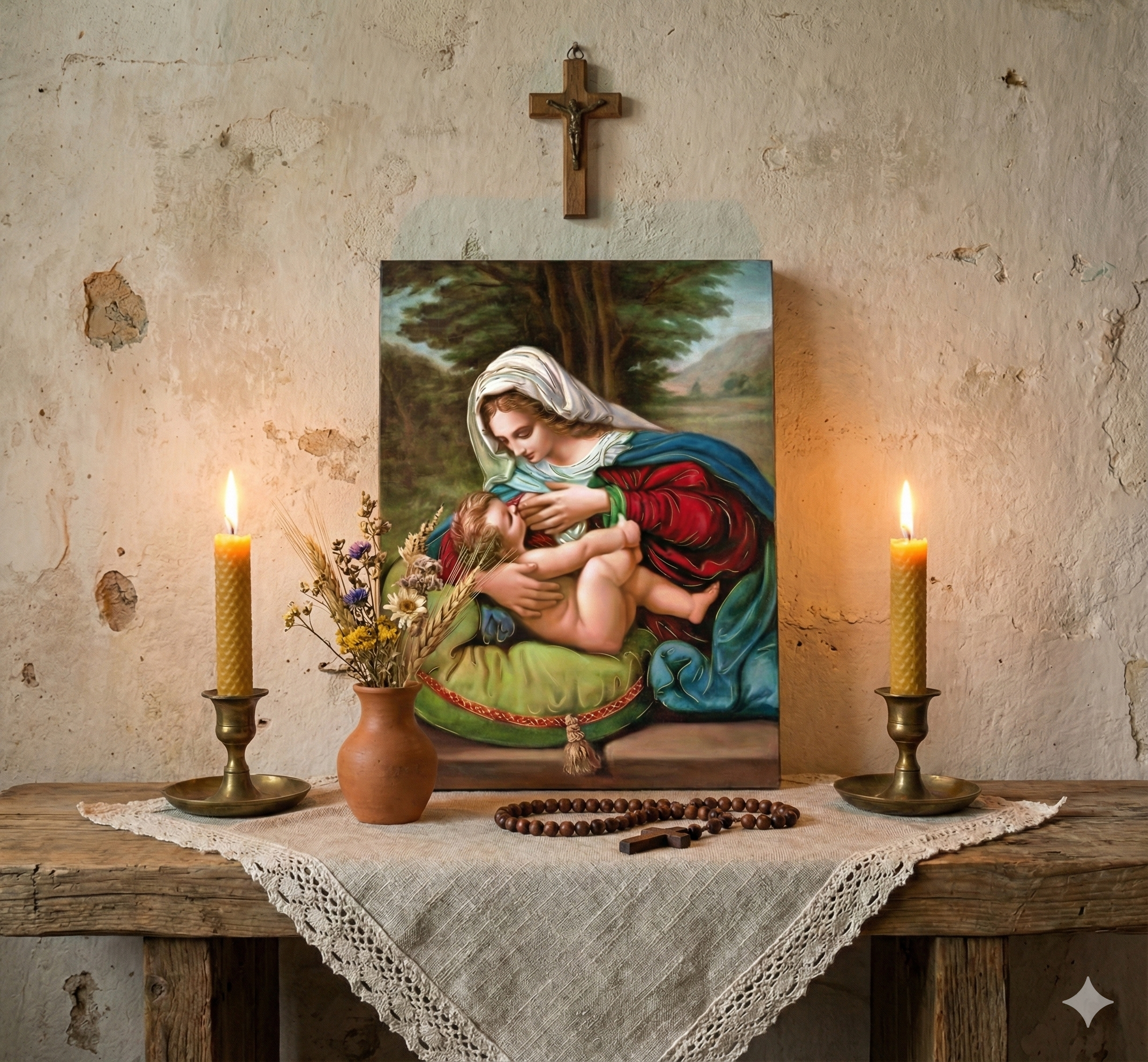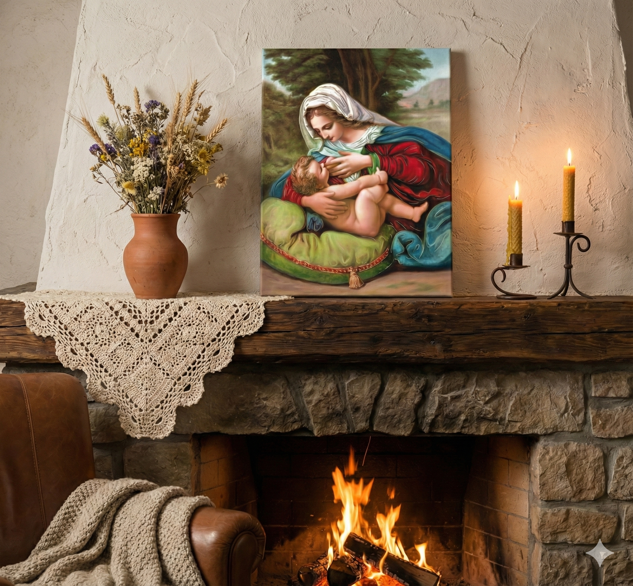 Ikona Matki Bożej Karmiącej z kolekcji ICONA SACRA™ – Alnus przedstawia Maryję karmiącą Dzieciątko Jezus, ukazując jedną z najgłębszych prawd wiary chrześcijańskiej – realne Wcielenie Syna Bożego. To wizerunek, który łączy czułość macierzyństwa z teologiczną głębią tajemnicy zbawienia.