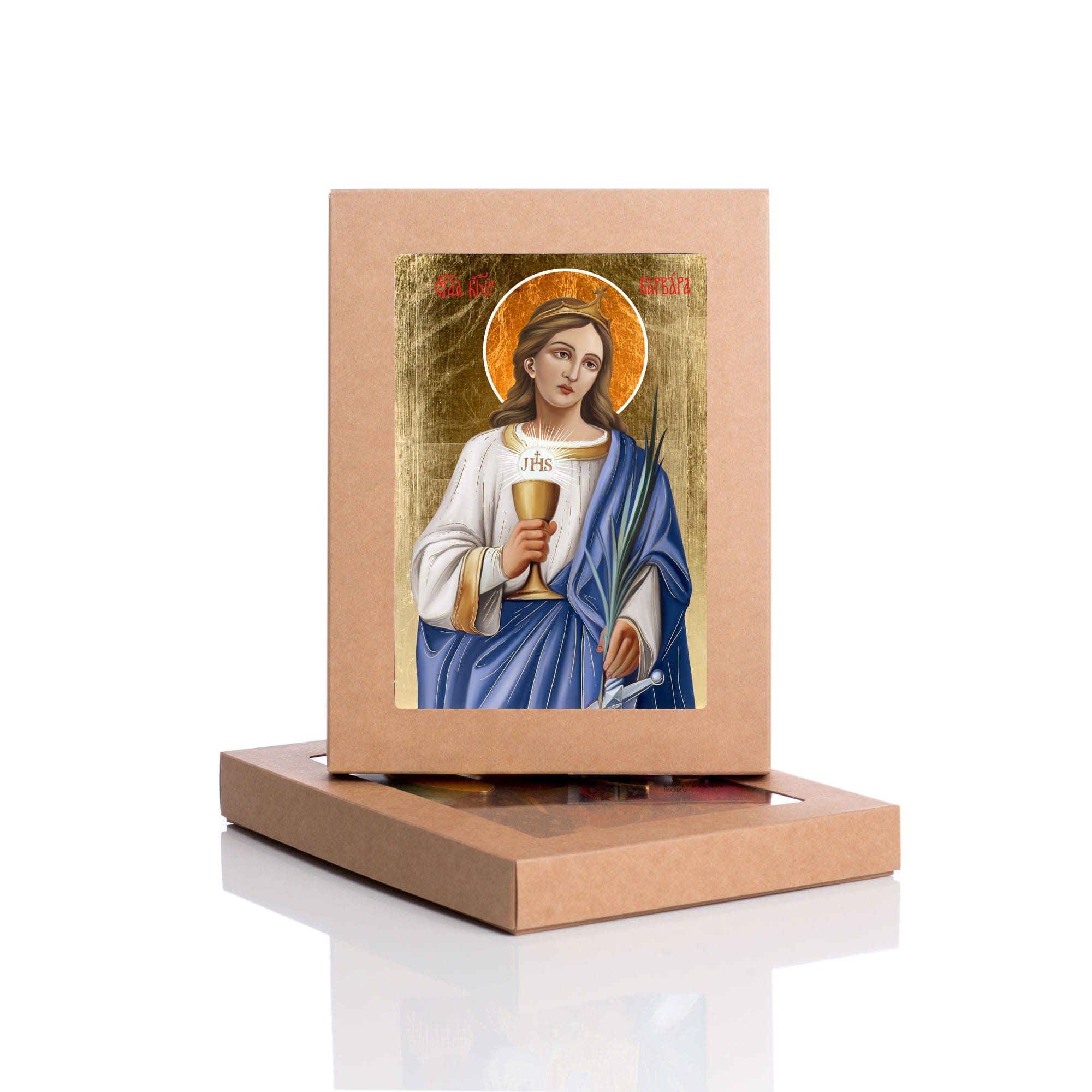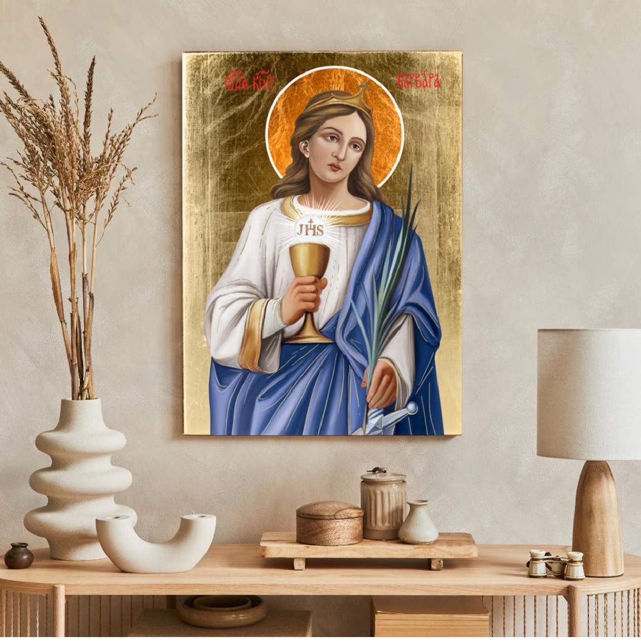 Ikona Świętej Barbary wykonana na naturalnej desce olchowej, ręcznie wykańczana i złocona złotem płatkowym. Kanoniczny wizerunek męczennicy i patronki dobrej śmierci, górników oraz osób narażonych na niebezpieczeństwo. Produkt polski z certyfikatem autentyczności.