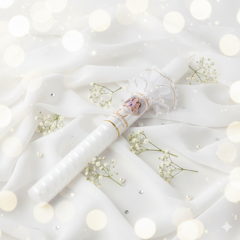 Delikatna świeca imienna na Chrzest z szyfonową osłonką – symbol duchowej lekkości i czystości. Ręcznie zdobiona, z nadrukiem imienia i daty Chrztu Świętego. Idealna pamiątka sakramentu i rodzinnej uroczystości.