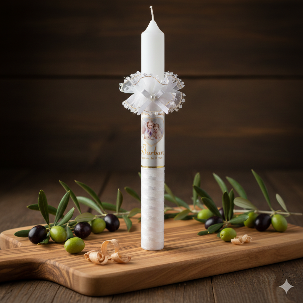 Świeca wykonywana jest indywidualnie, z możliwością nadruku imienia dziecka, daty uroczystości i dedykacji. Zastosowana technologia druku cyfrowego Ink-Jet gwarantuje trwałe, estetyczne i eleganckie wykończenie nadruku. Dzięki temu świeca staje się nie tylko pamiątką, ale również pięknym symbolem wiary.