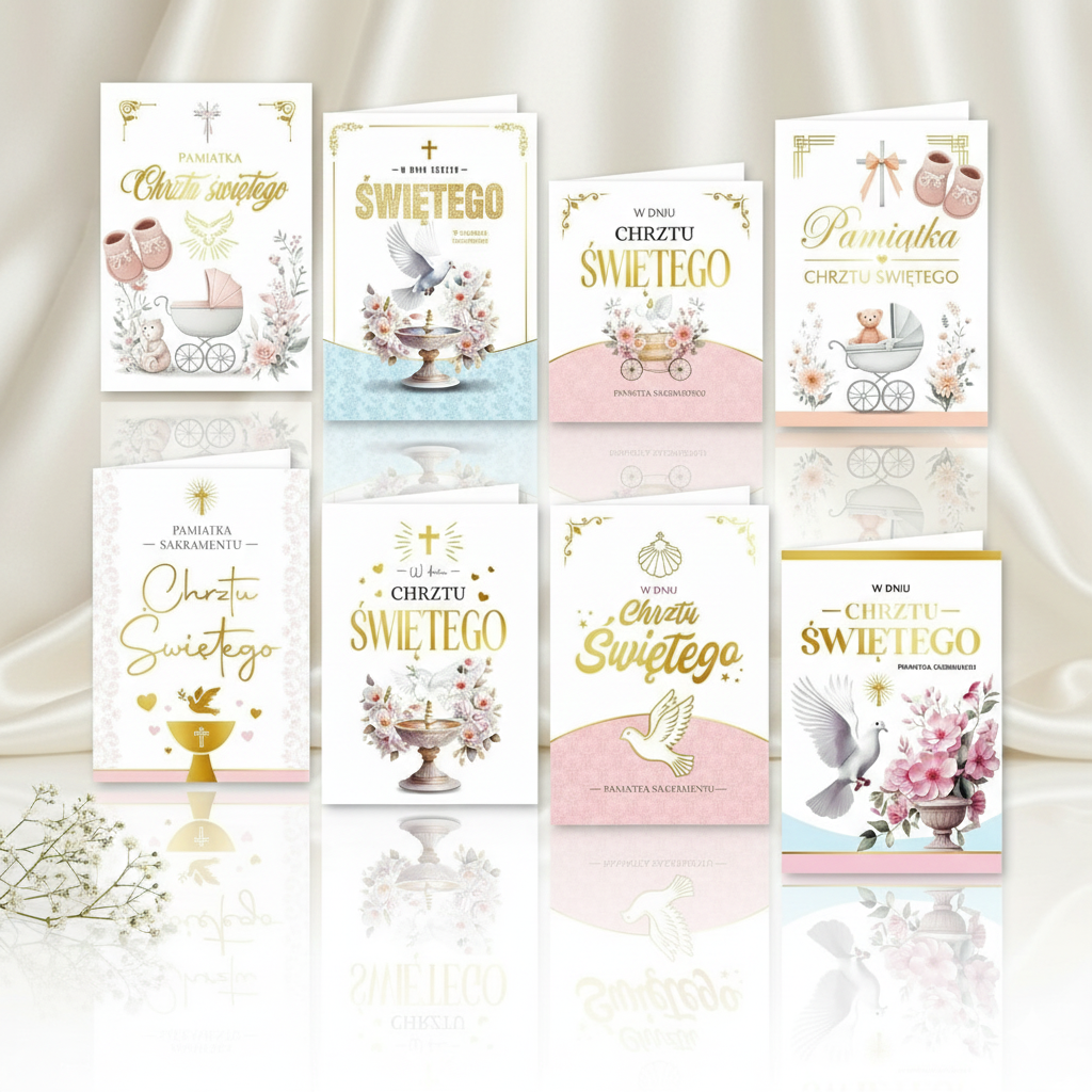Ten wyjątkowy karnet z życzeniami na Chrzest Święty to elegancka pamiątka, która pięknie podkreśli duchowy i rodzinny charakter sakramentu. Kolekcja obejmuje kilka różnorodnych wzorów – od pastelowych kompozycji z wózeczkiem, przez klasyczne motywy sakramentalne, po minimalistyczne i złocone grafiki. Dzięki temu każdy może wybrać wariant idealnie dopasowany do stylu uroczystości i płci dziecka.