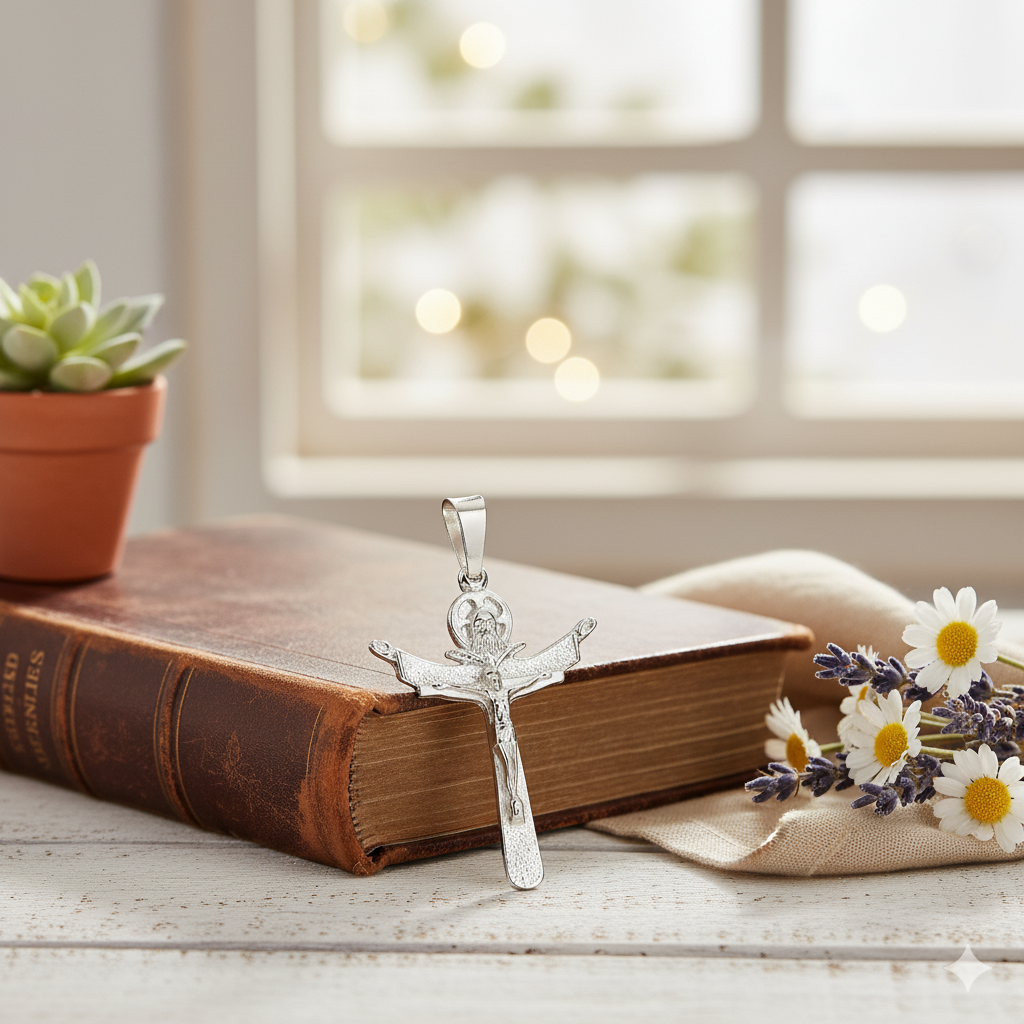 Ten klasyczny krzyż srebrny Trójcy Świętej z wizerunkiem Jezusa jest głęboko zakorzeniony w duchowej tradycji Kościoła. Symbolizuje jedność Ojca, Syna i Ducha Świętego – tajemnicę wiary, w której Bóg objawia się jako Trójca Osób, zjednoczonych w miłości i działaniu. W centrum znajduje się postać Jezusa Chrystusa, ukrzyżowanego dla zbawienia świata – znak ofiary, miłosierdzia i nadziei.