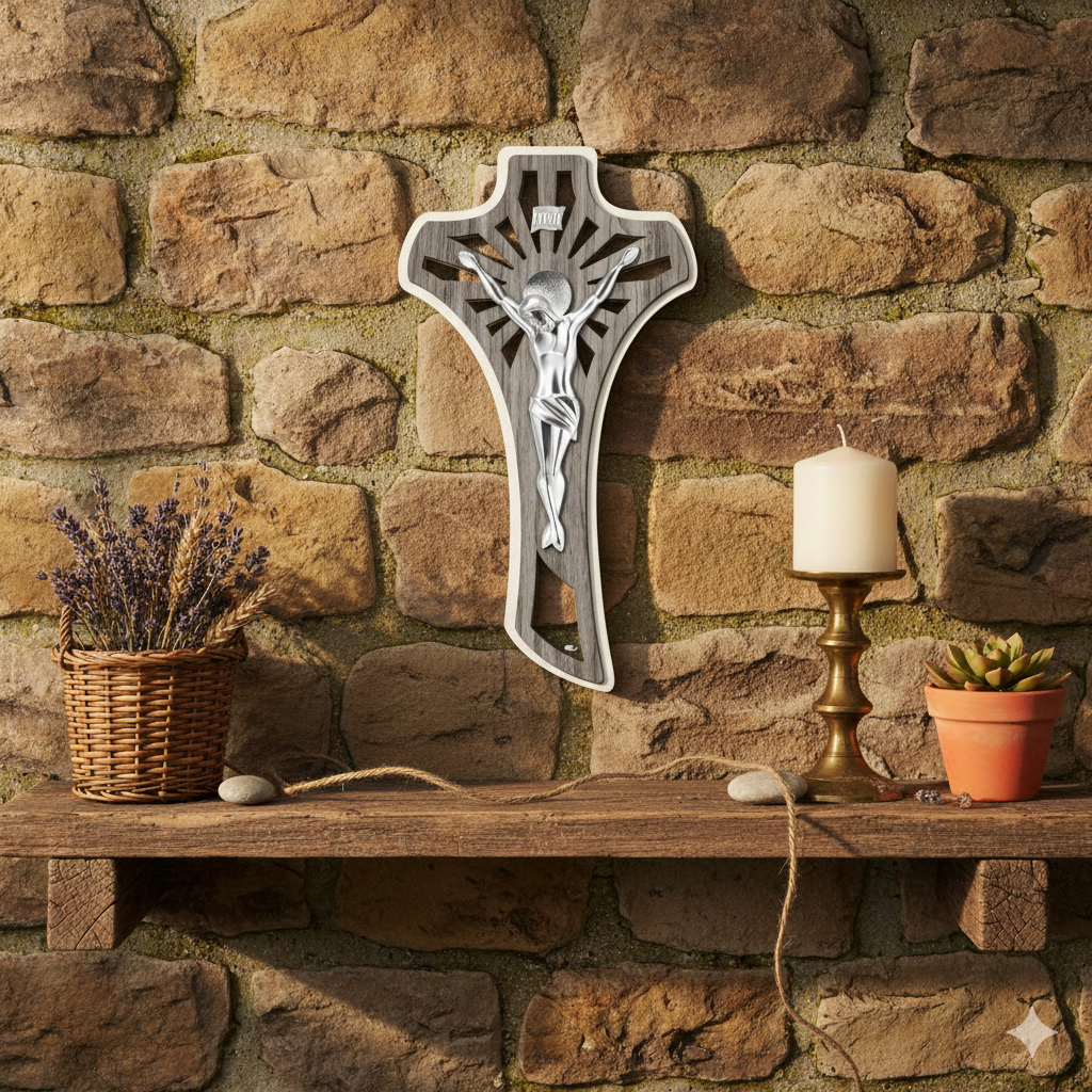 Krzyż srebrny na drewnianym panelu 52 cm z kolekcji ARGENTO SACRO™ jest wyrazem głębokiej duchowości i piękna chrześcijańskiej tradycji. Włoski projekt podkreśla połączenie dwóch światów — szlachetnego srebra MIRO-SILVER® oraz naturalnego drewna, tworząc kompozycję, która wprowadza do wnętrza atmosferę modlitwy, pokoju i Bożej obecności.