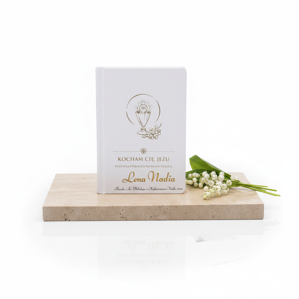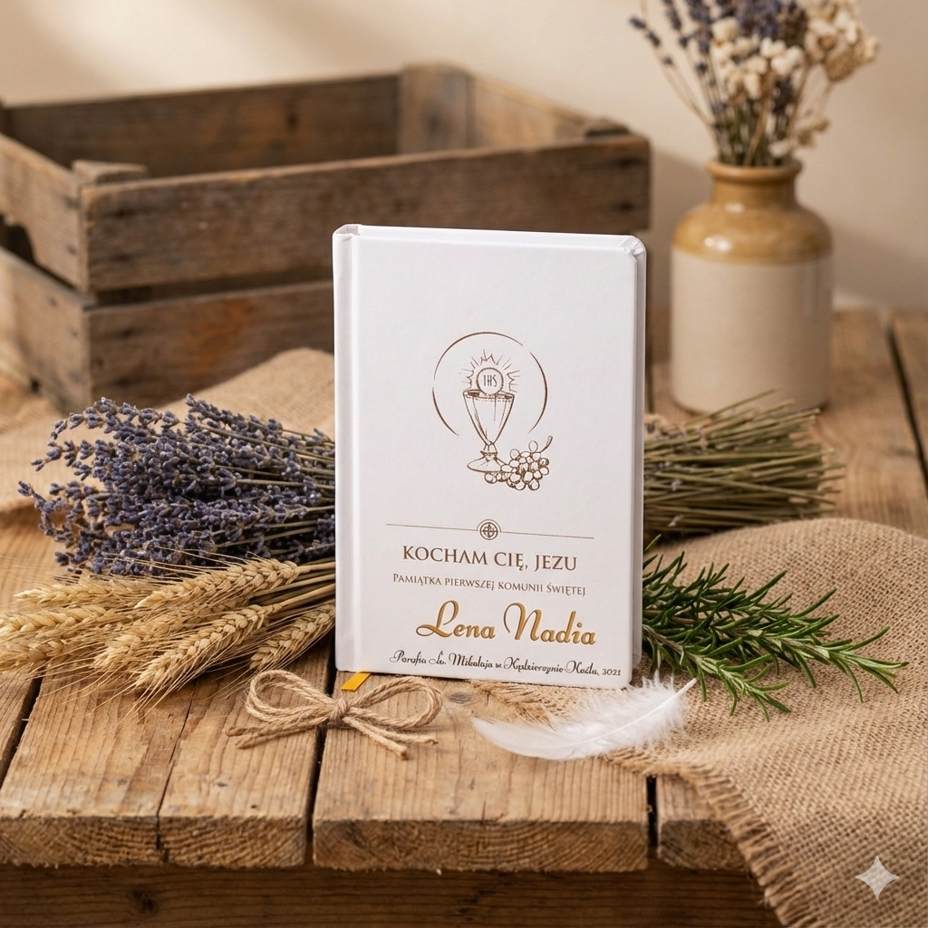 Nadruk UV Ink-Jet nanoszony jest bezpośrednio na powierzchnię okładki i utrwalany światłem UV, dzięki czemu zachowuje estetyczny wygląd przez wiele lat. Wewnątrz książeczki znajduje się również miejsce na indywidualne wpisy – daty sakramentów, podpisy spowiedników oraz osobiste notatki.