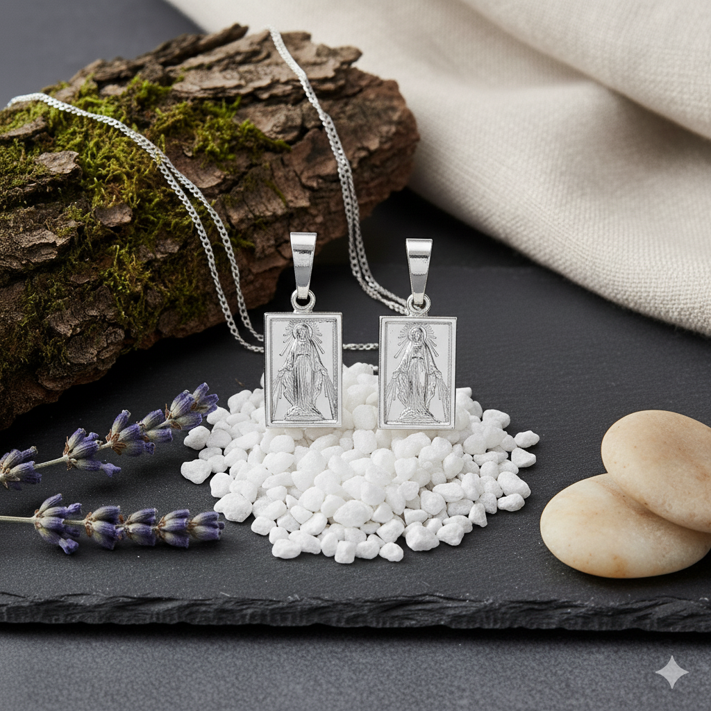Srebrne medaliki maryjne i chrystologiczne – symbole wiary, ochrony i duchowego zawierzenia.