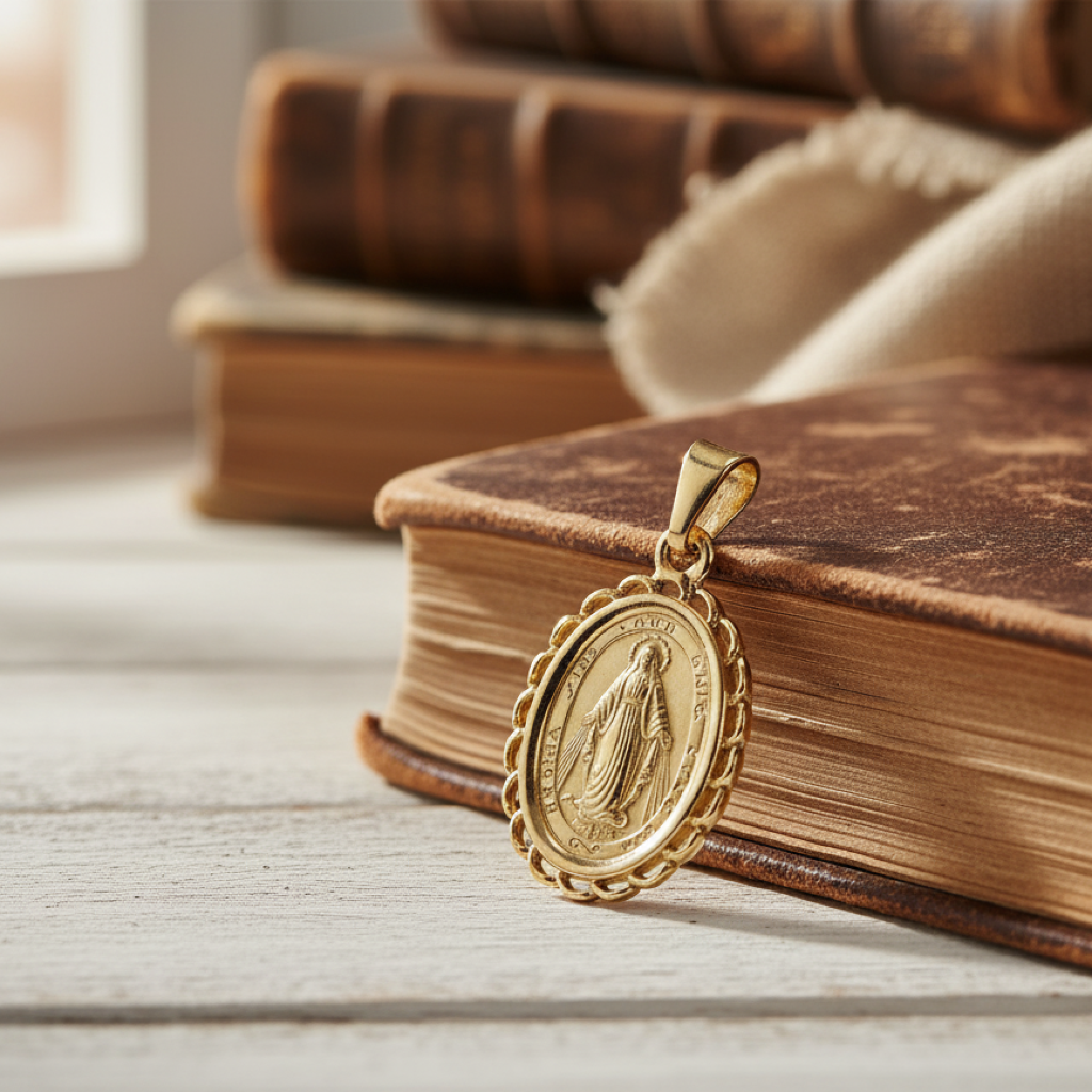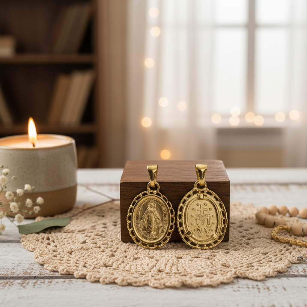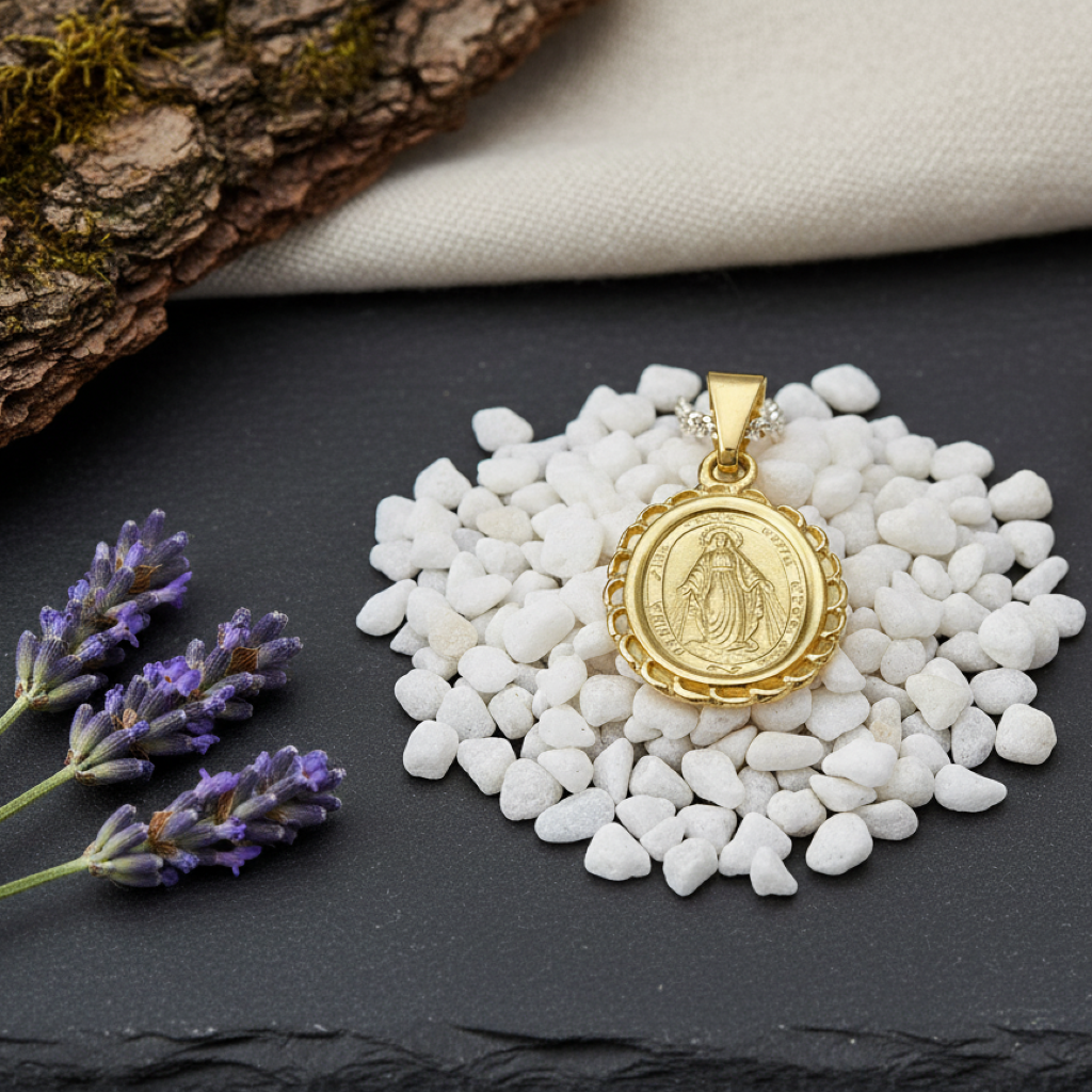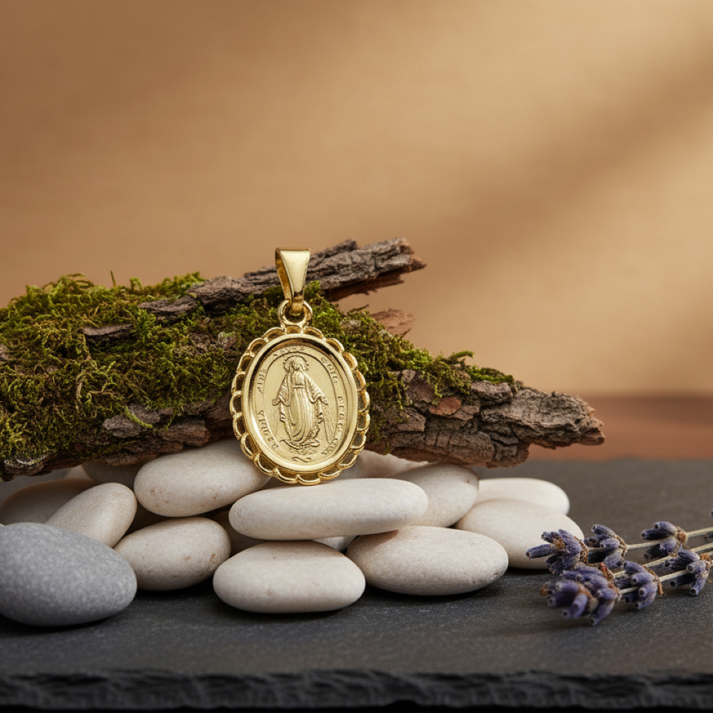 Cudowny Medalik z wizerunkiem Matki Bożej Niepokalanej to symbol łaski, ochrony i duchowej obecności Maryi w życiu wierzących. Objawiony św. Katarzynie Labouré w 1830 roku w Paryżu, stał się znakiem wiary i zaufania wobec Bożej Opatrzności. Złocone wykończenie dodaje mu szlachetności i elegancji, podkreślając jego sakralny charakter.