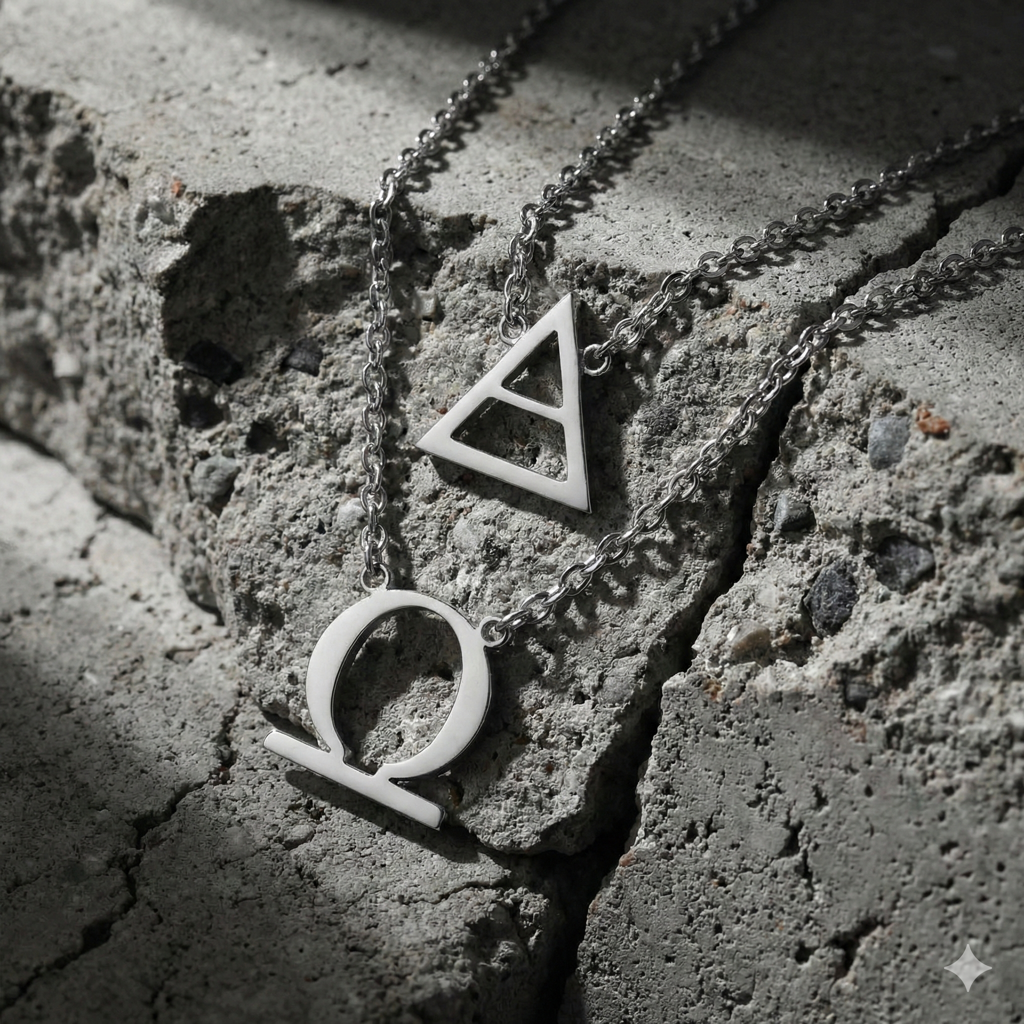 Naszyjnik Alfa i Omega wykonany ze stali nierdzewnej (Stainless Steel) to ponadczasowy symbol Chrystusa jako Początku i Końca. Subtelna, trwała biżuteria religijna do codziennego noszenia – znak wiary, zawierzenia i duchowej tożsamości.