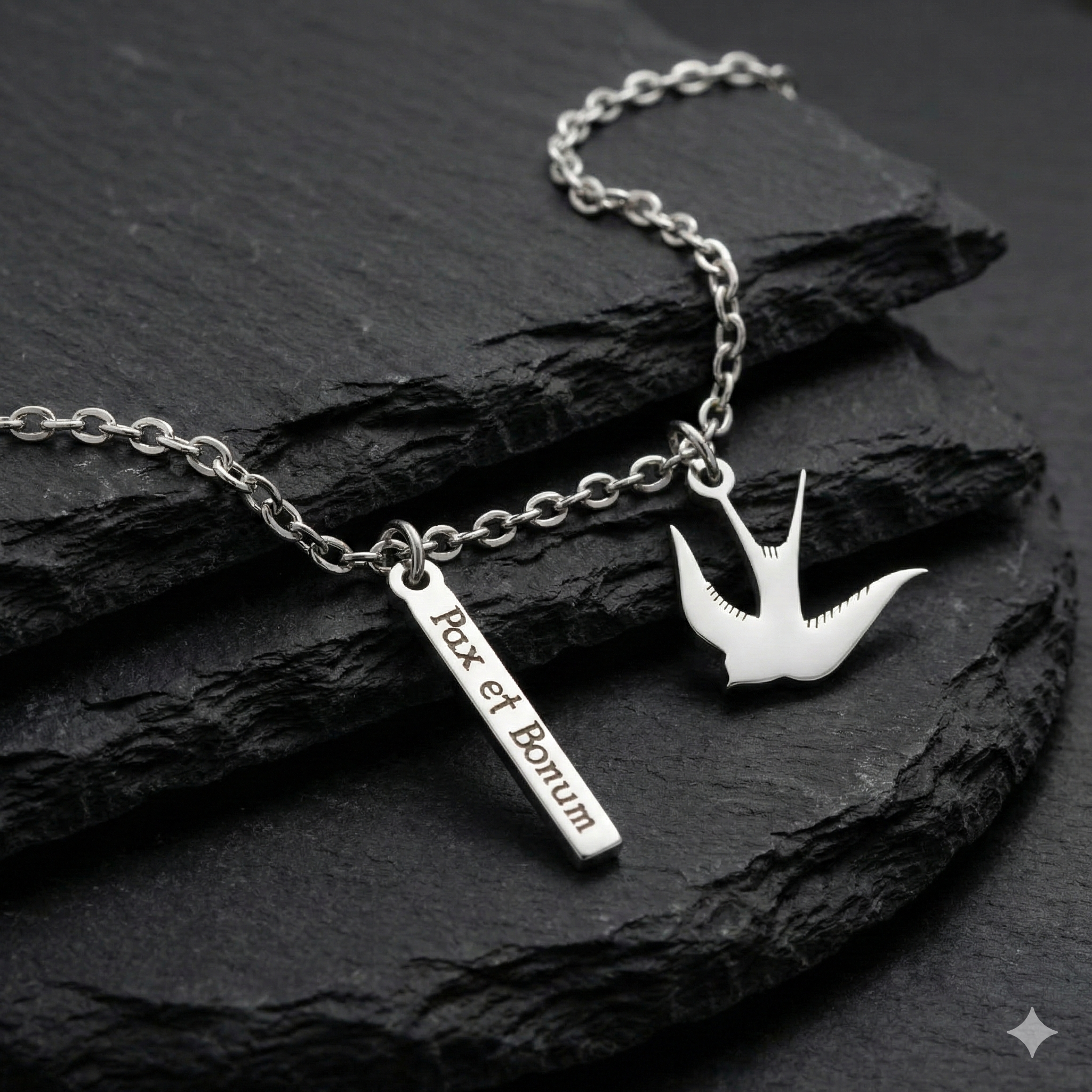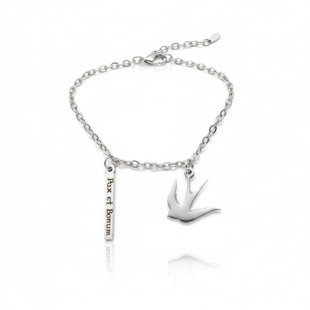 Naszyjnik z motywem jaskółki i napisem „Pax et Bonum”, wykonany ze stali nierdzewnej (Stainless Steel). Subtelny symbol pokoju, dobra i chrześcijańskiej nadziei – trwała biżuteria do codziennego noszenia.