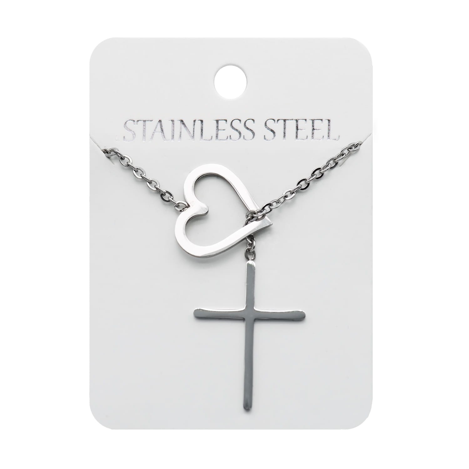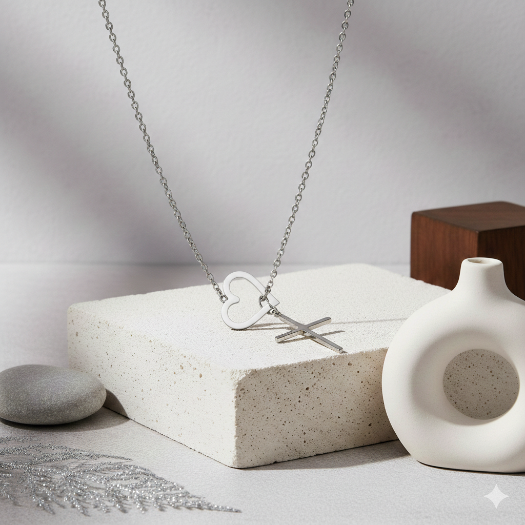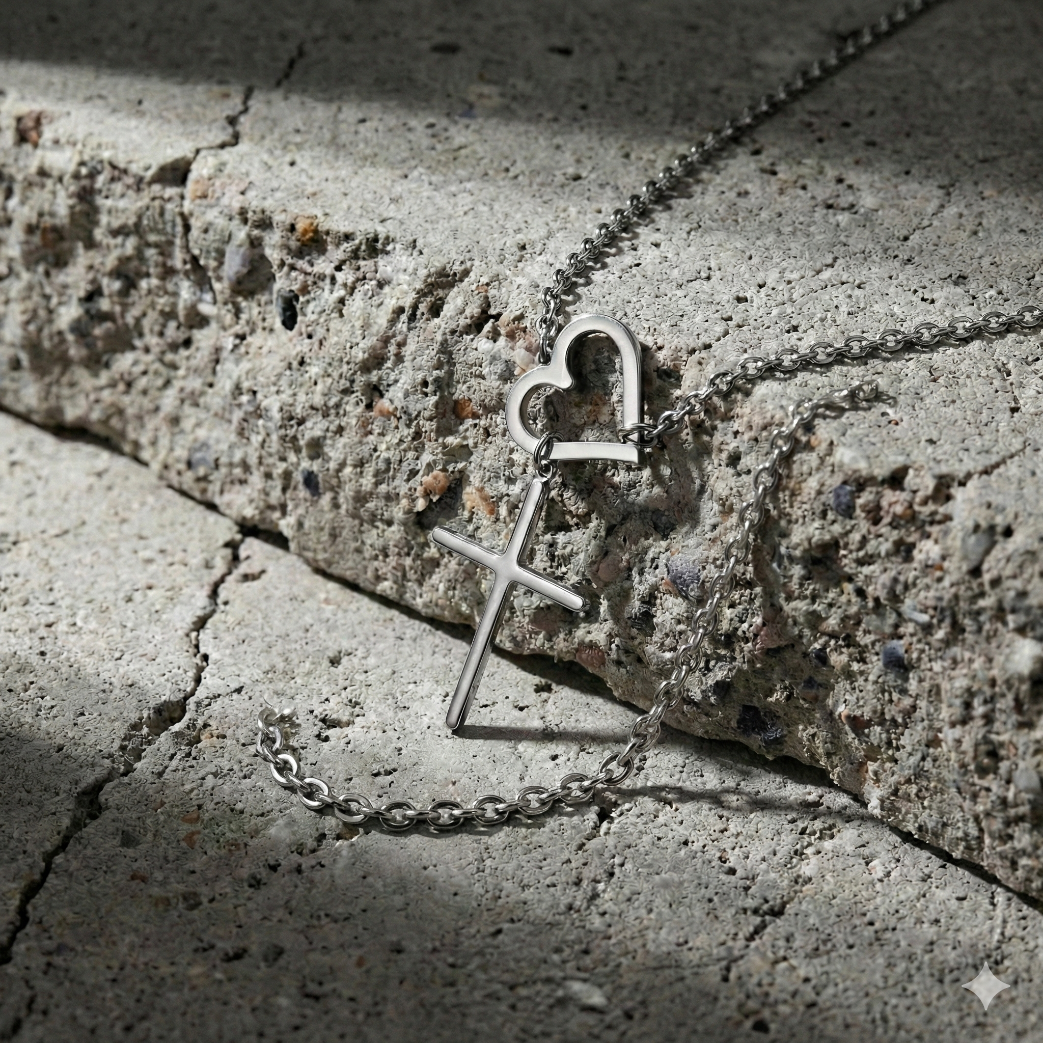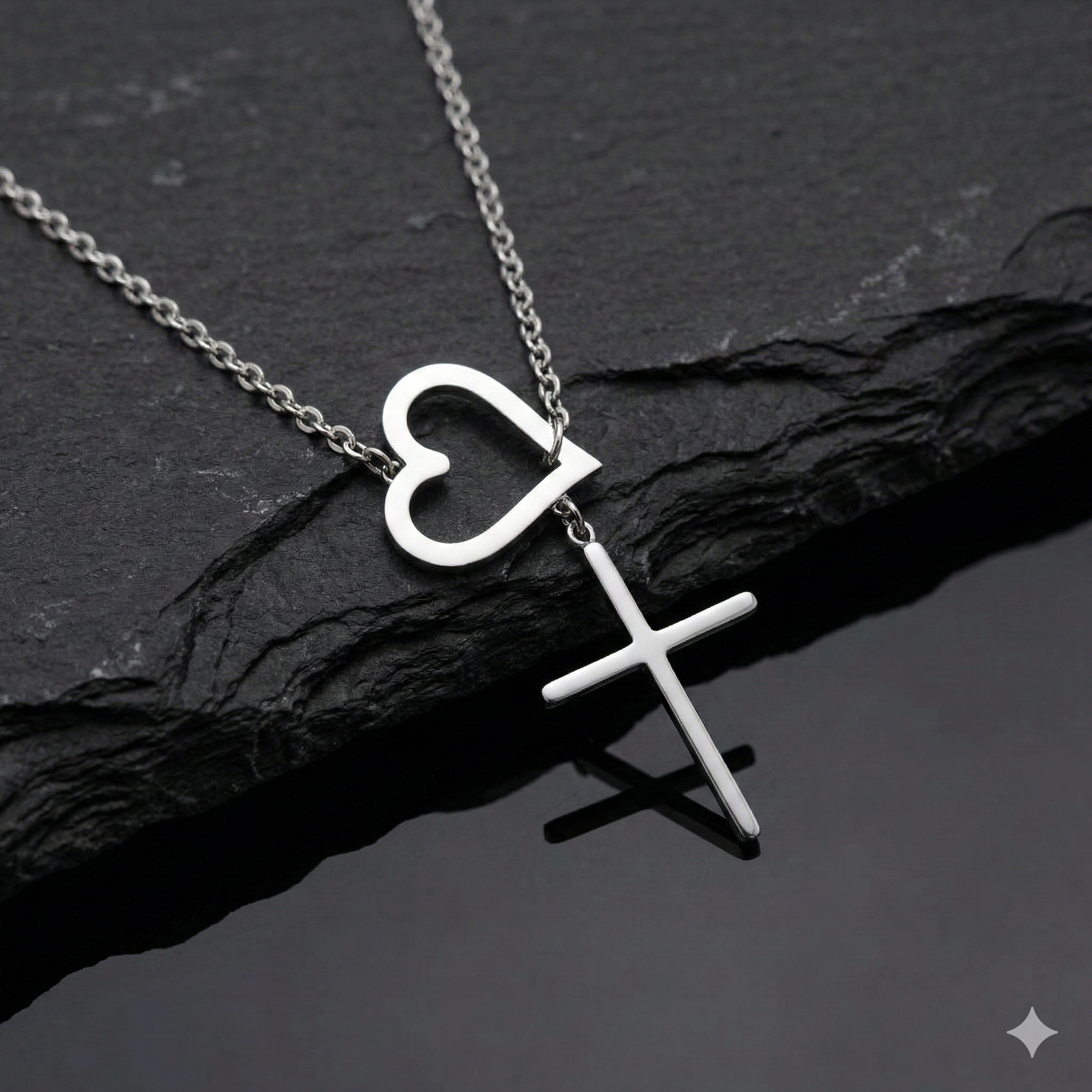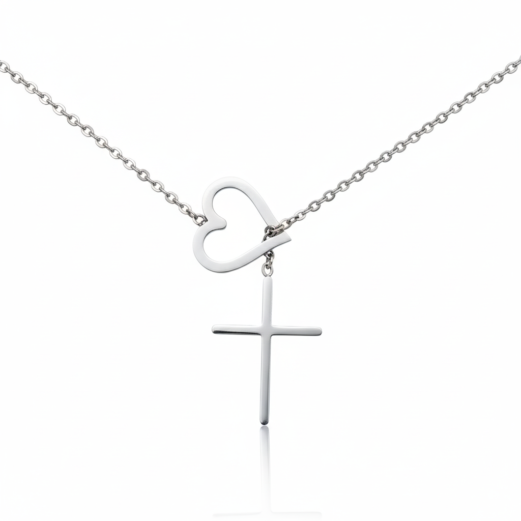 Naszyjnik z motywem serca połączonego z krzyżem, wykonany ze stali nierdzewnej (Stainless Steel). Subtelny symbol miłości, wiary i zawierzenia Bogu – trwała biżuteria religijna do codziennego noszenia.