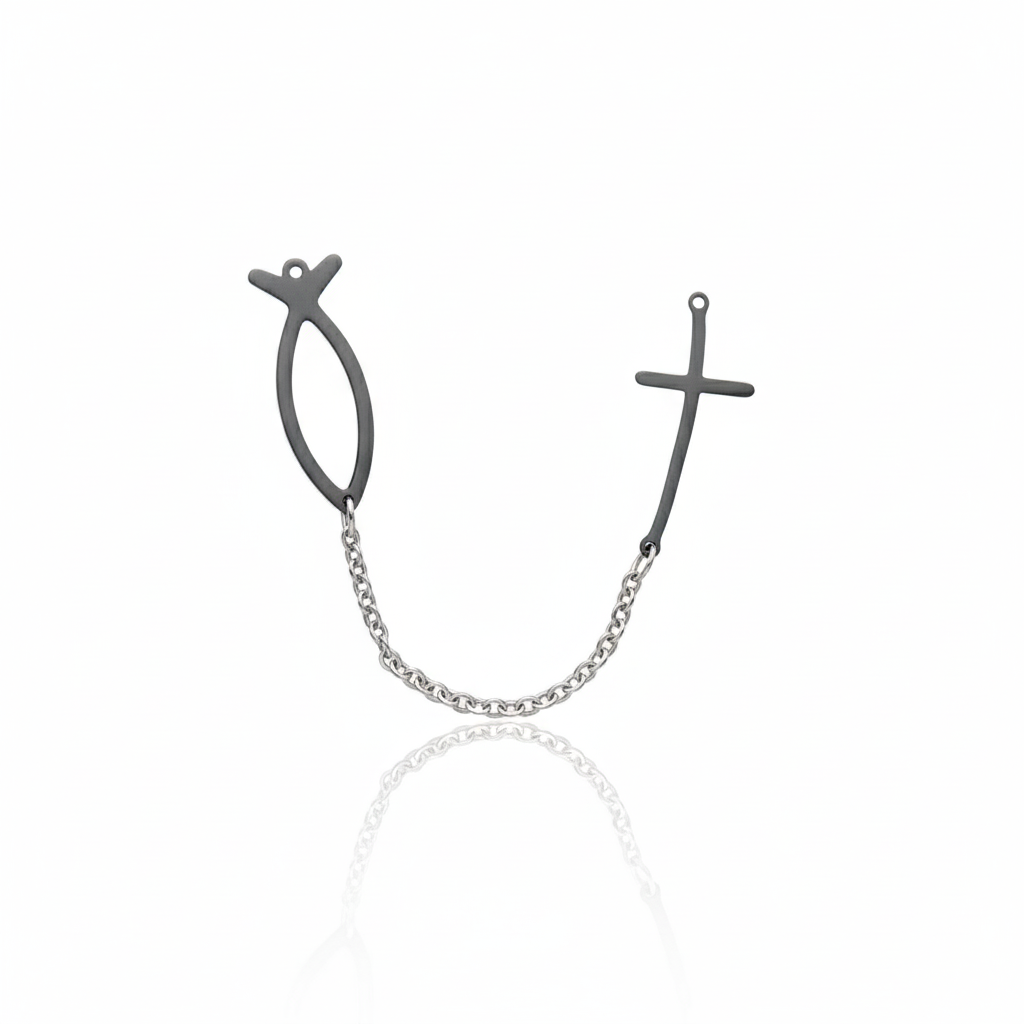 Precyzyjnie wykończony symbol ryby i krzyża tworzy harmonijną, nowoczesną formę, łączącą minimalizm z duchową głębią.