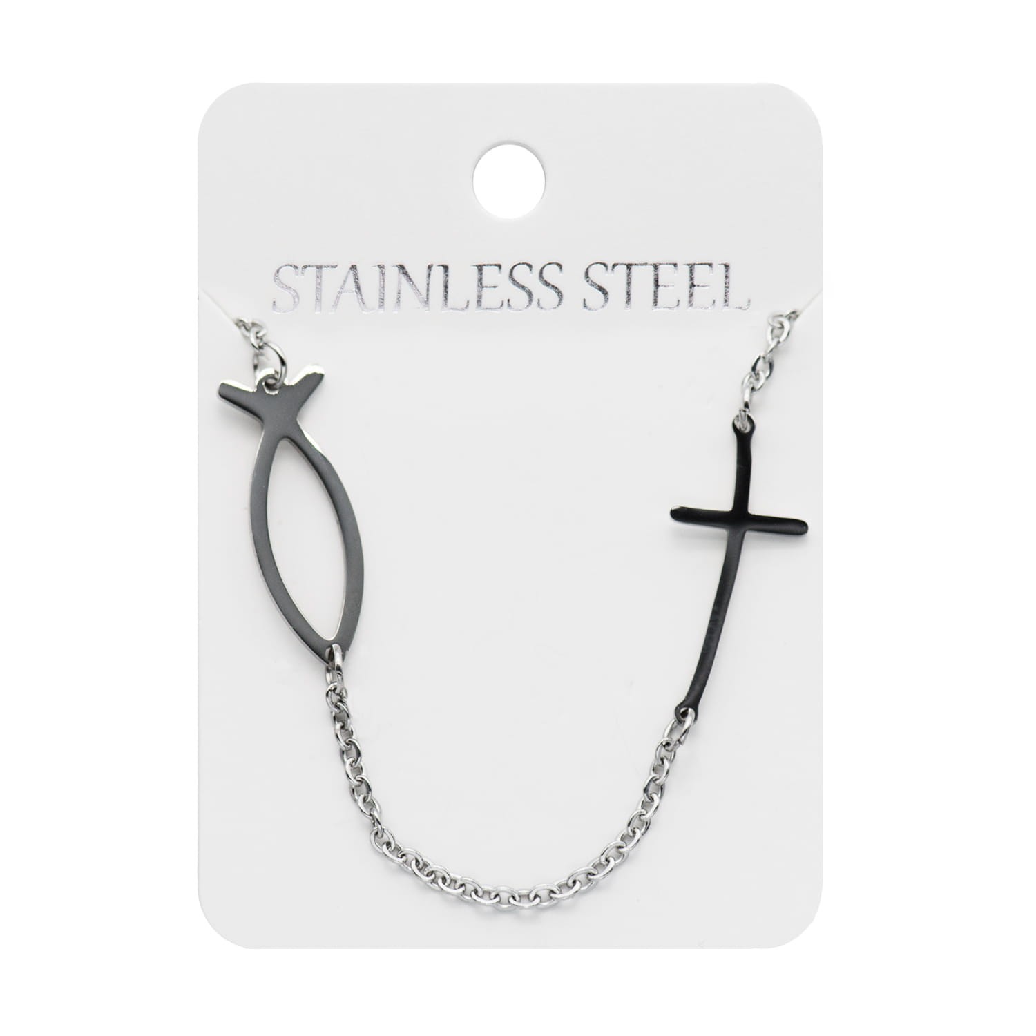 Naszyjnik z symbolem Ichthys – chrześcijańskiej ryby połączonej z krzyżem, wykonany ze stali nierdzewnej (Stainless Steel). Subtelny, trwały znak wiary i przynależności do Chrystusa – idealny do codziennego noszenia.
