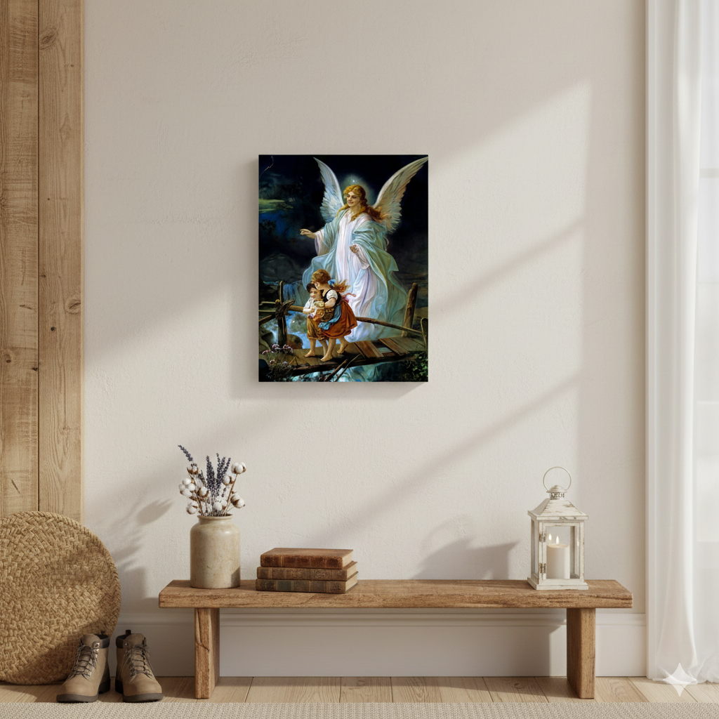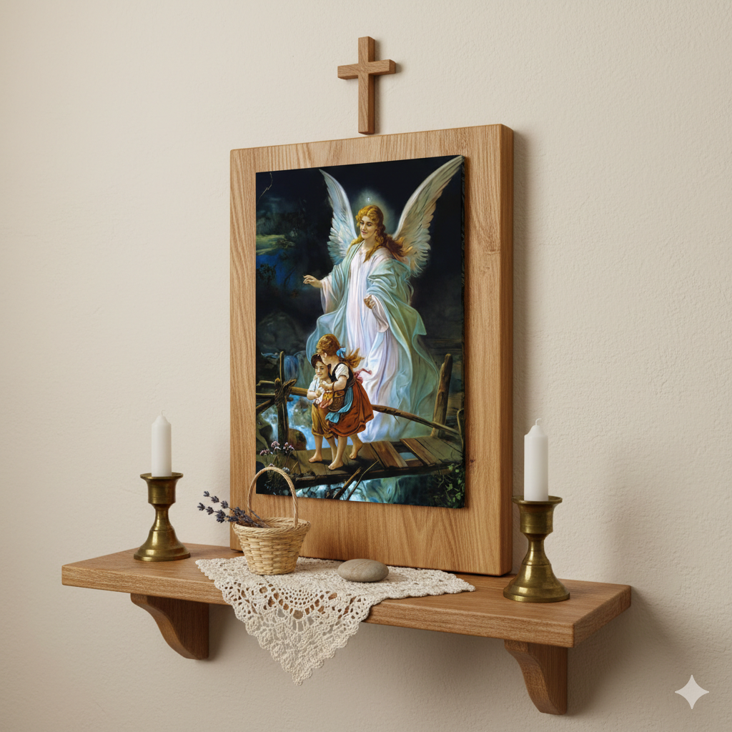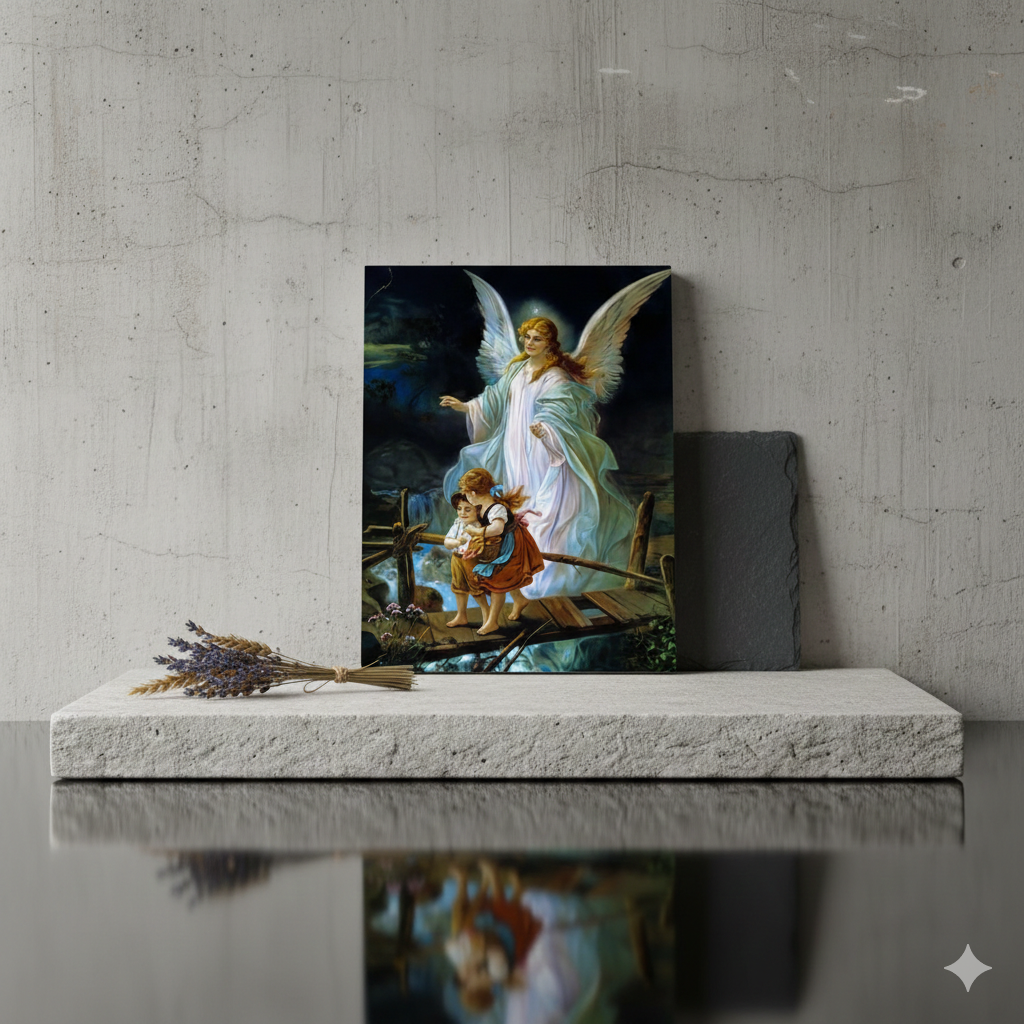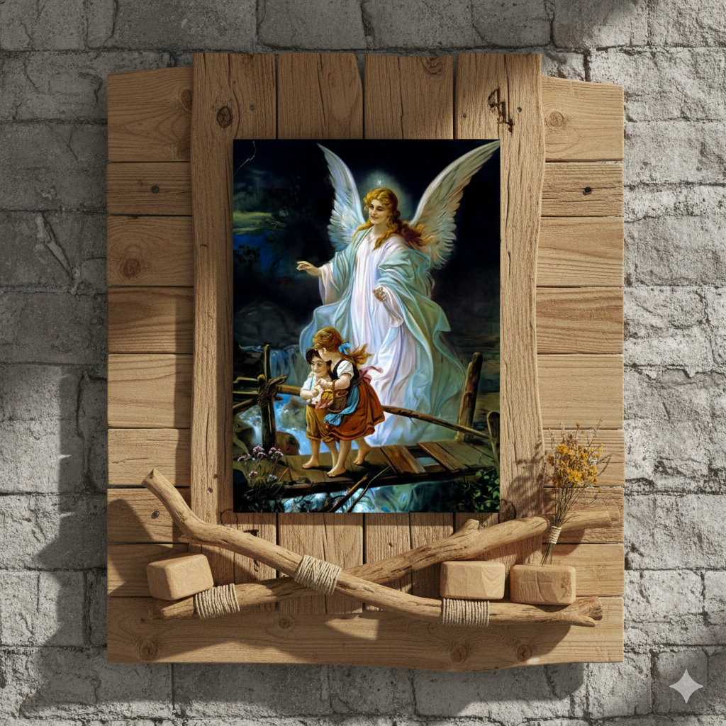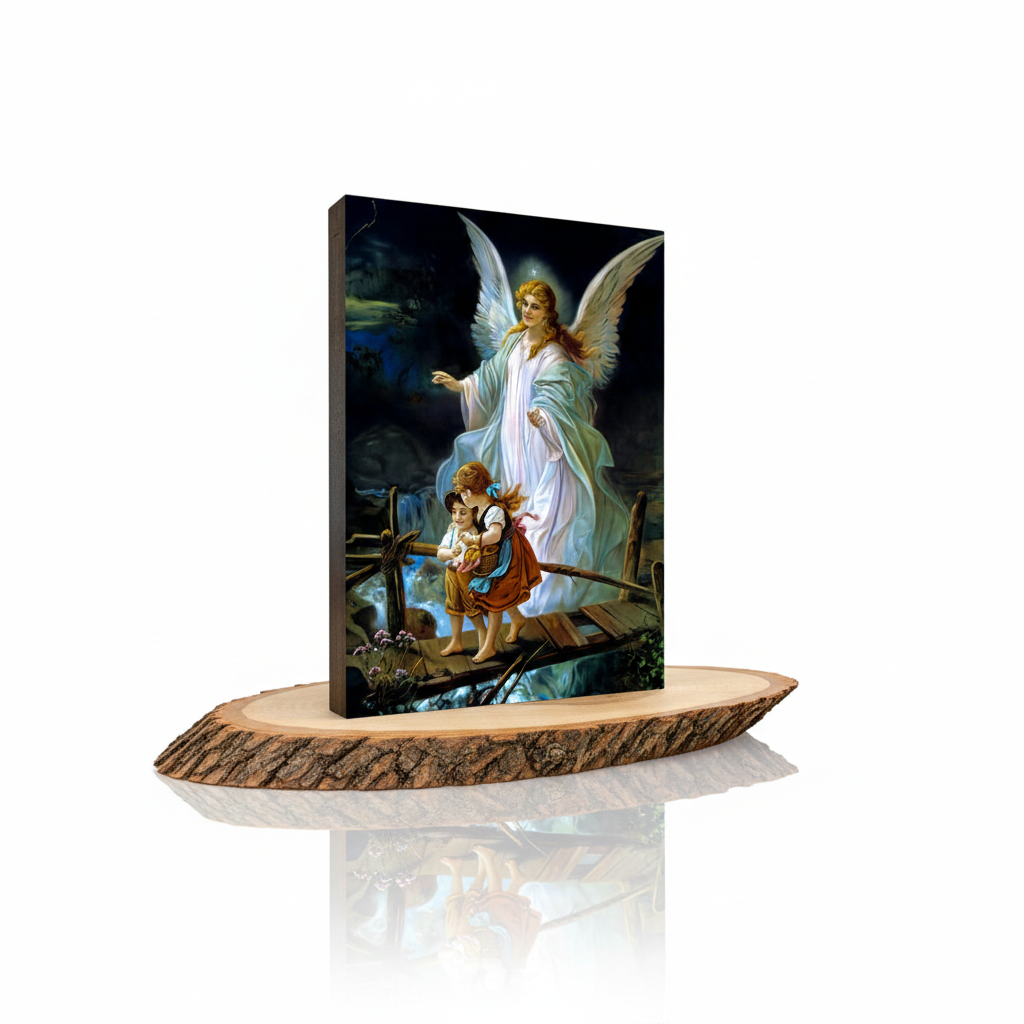 Obraz religijny Anioła Stróża z dziećmi wykonany na naturalnej desce lipowej o grubości 25 mm. Trwały druk cyfrowy, lakierowany front i estetyczne wykończenie sprawiają, że obraz nawiązuje do formy ikony i jest gotowy do zawieszenia lub postawienia.