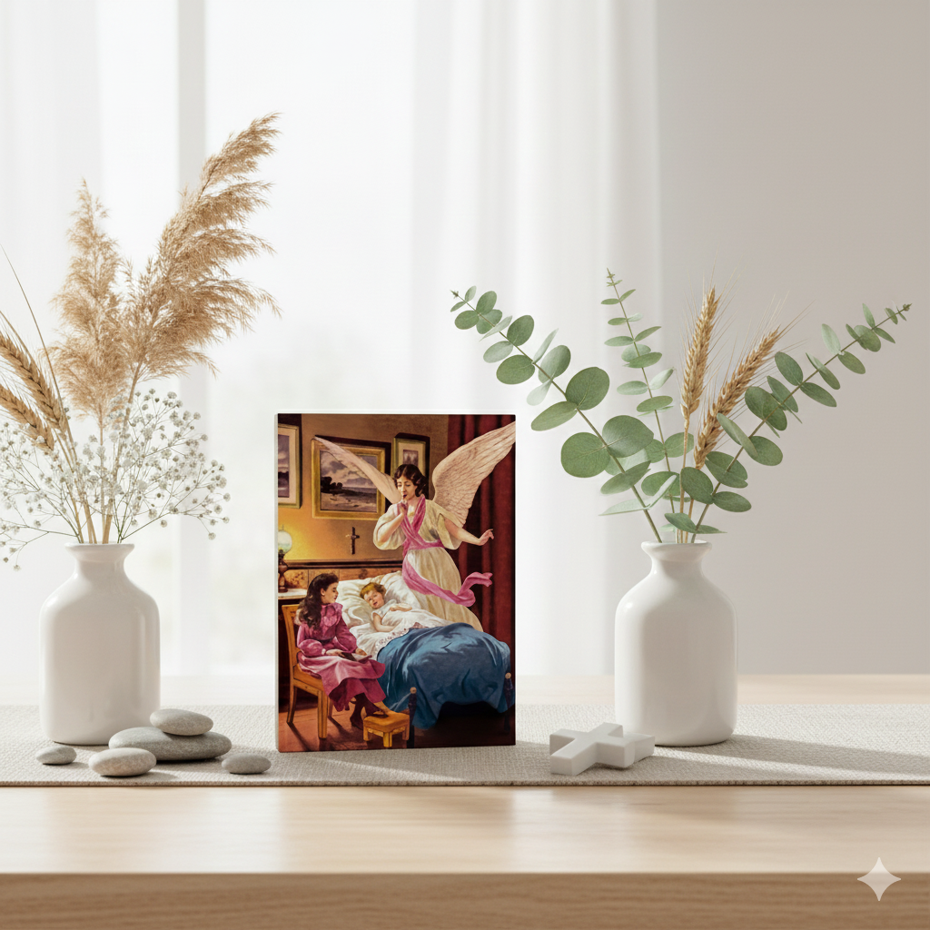 Motyw Anioła Stróża szczególnie mocno związany jest z sakramentami i momentami przełomowymi w życiu – takimi jak Chrzest Święty, Pierwsza Komunia, Bierzmowanie czy zawarcie małżeństwa. Obraz ten przypomina, że człowiek nigdy nie jest sam, a jego droga objęta jest Bożą opieką.