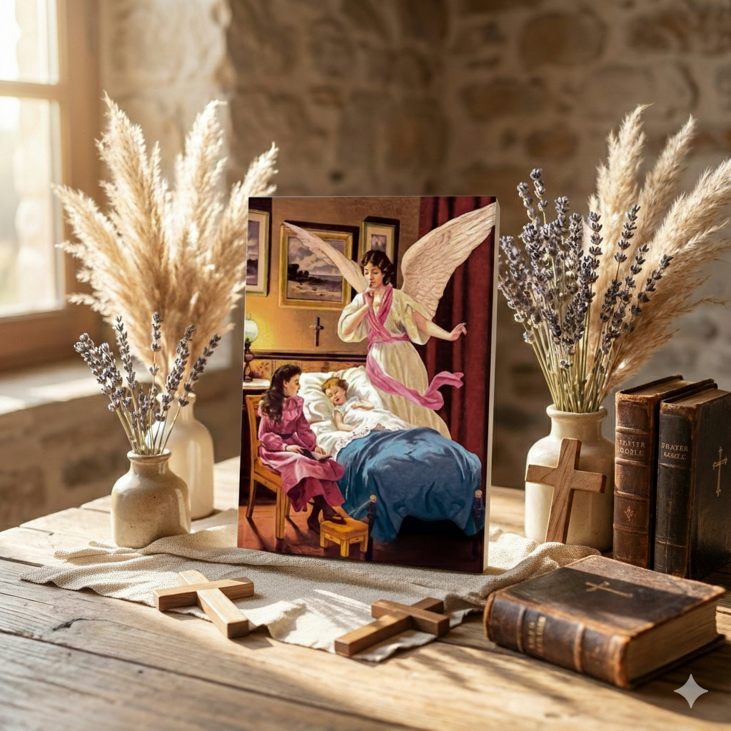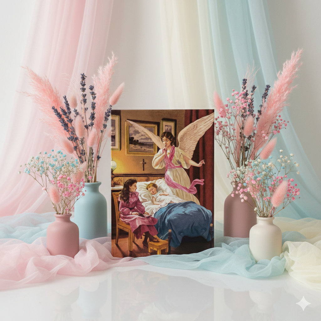Anioł Stróż – „Anielska opieka” to obraz o głębokim, duchowym przesłaniu. Wizerunek Anioła Stróża od wieków symbolizuje Bożą obecność, ochronę i prowadzenie człowieka na drogach codziennego życia. Jest znakiem troski, bezpieczeństwa oraz niewidzialnej opieki, która towarzyszy zarówno dzieciom, jak i dorosłym.