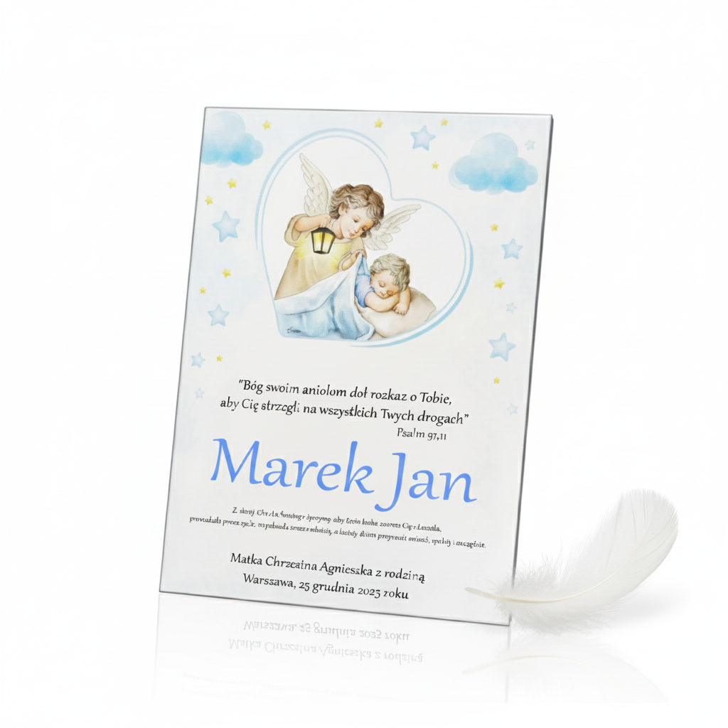 Elegancki obraz sakralny z motywem Anioła Stróża czuwającego nad śpiącym dzieckiem. Wersja Baby Blue 20×25 cm z delikatną pastelową kolorystyką i trwałym nadrukiem Ink-Jet. Idealna pamiątka Chrztu Świętego, narodzin lub urodzin dziecka — ponadczasowy symbol opieki i Bożego błogosławieństwa.