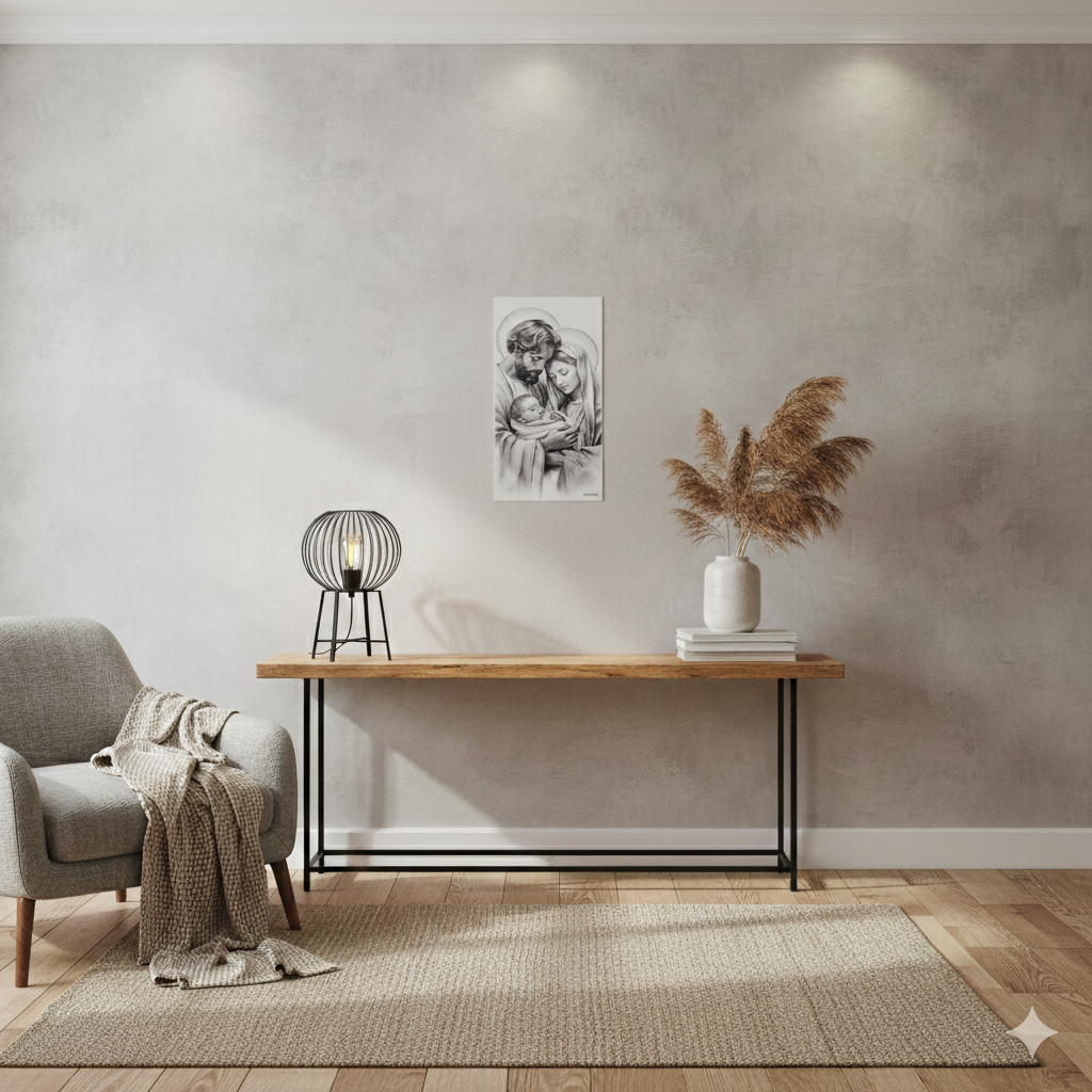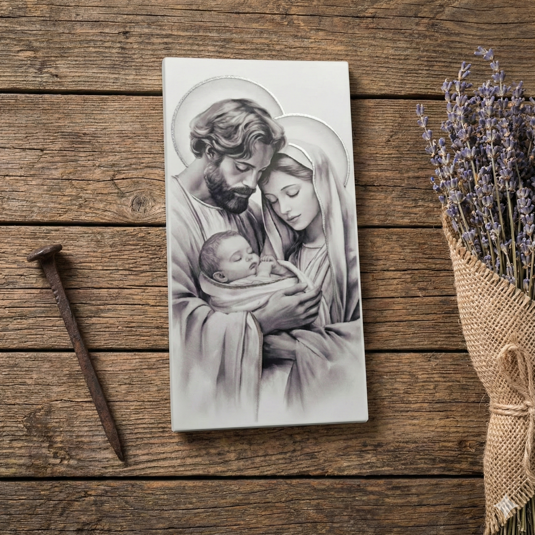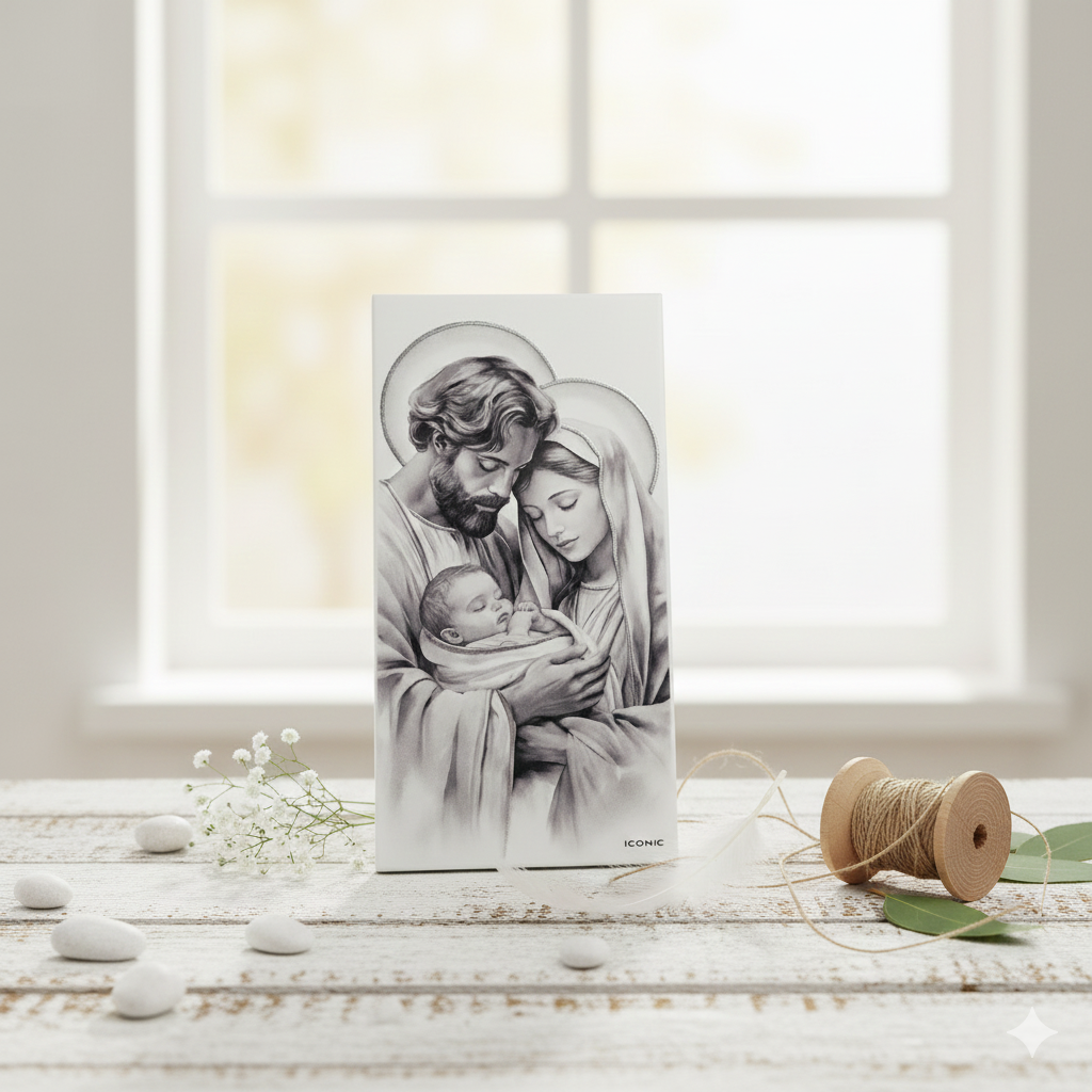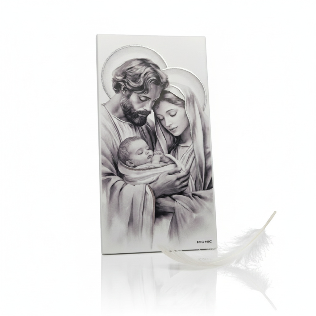 Elegancki obraz sakralny ICONIC™ przedstawiający Świętą Rodzinę, wzbogacony srebrzonymi aureolami i delikatnym efektem 3D, który nadaje motywowi głębi i blasku. Wykonany w technologii Ink-Jet, z wyjątkową dbałością o detale. Idealny prezent chrzcielny, komunijny lub do domowego kącika modlitewnego. Możliwość personalizacji.